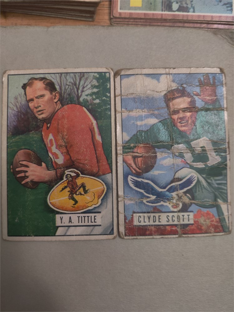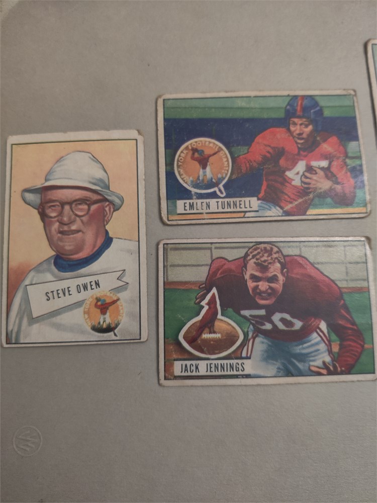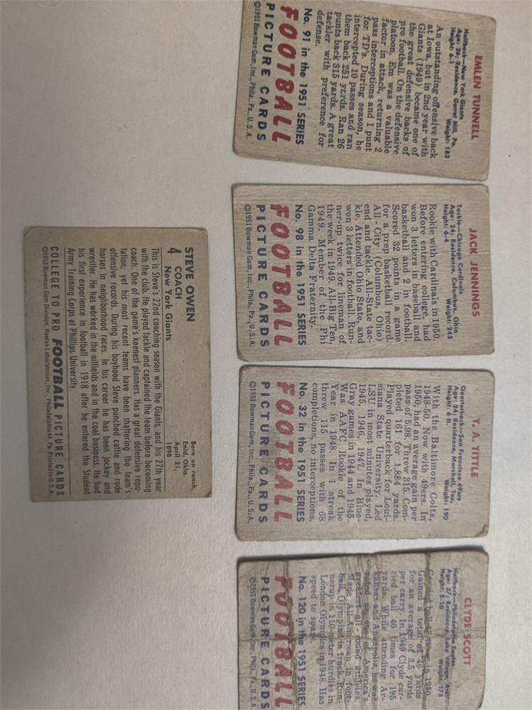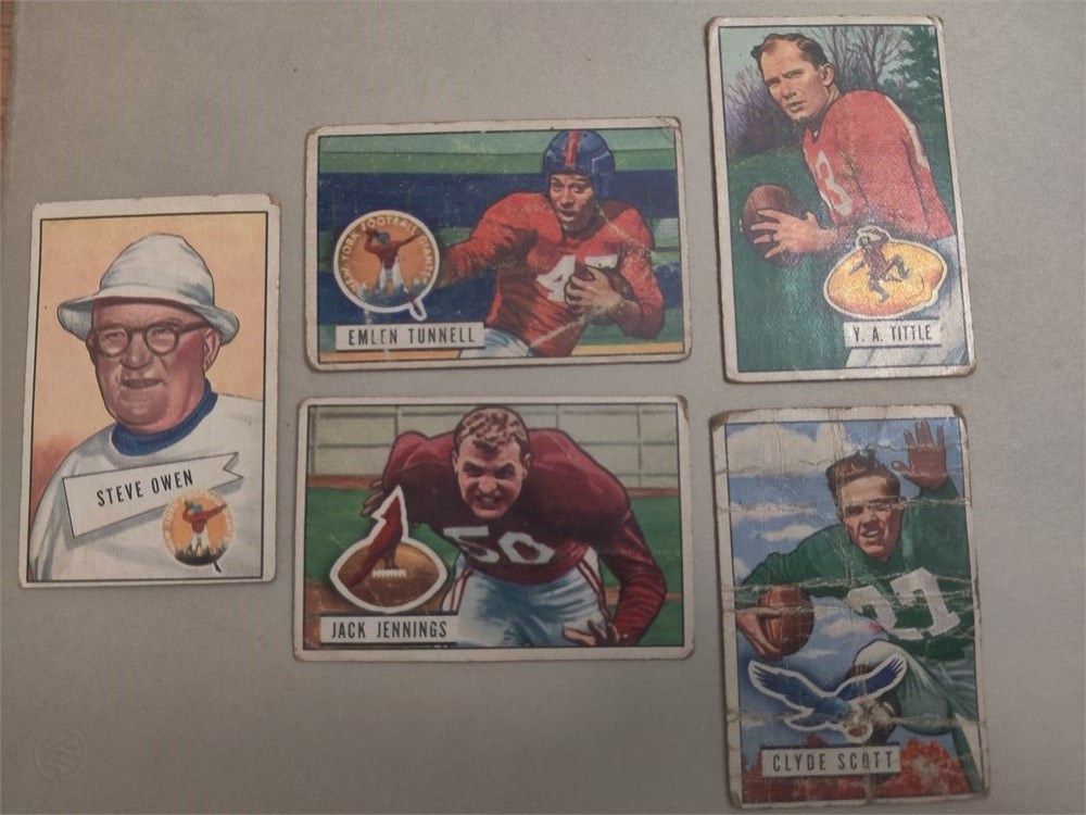 Lot of five 1950s Bowman football cards. For the cards or from 1951 the coach card is from 1952. Cards are in condition shown. Does include Hall of famers YA Tittle, Steve Owen and Emlen Tunnell.