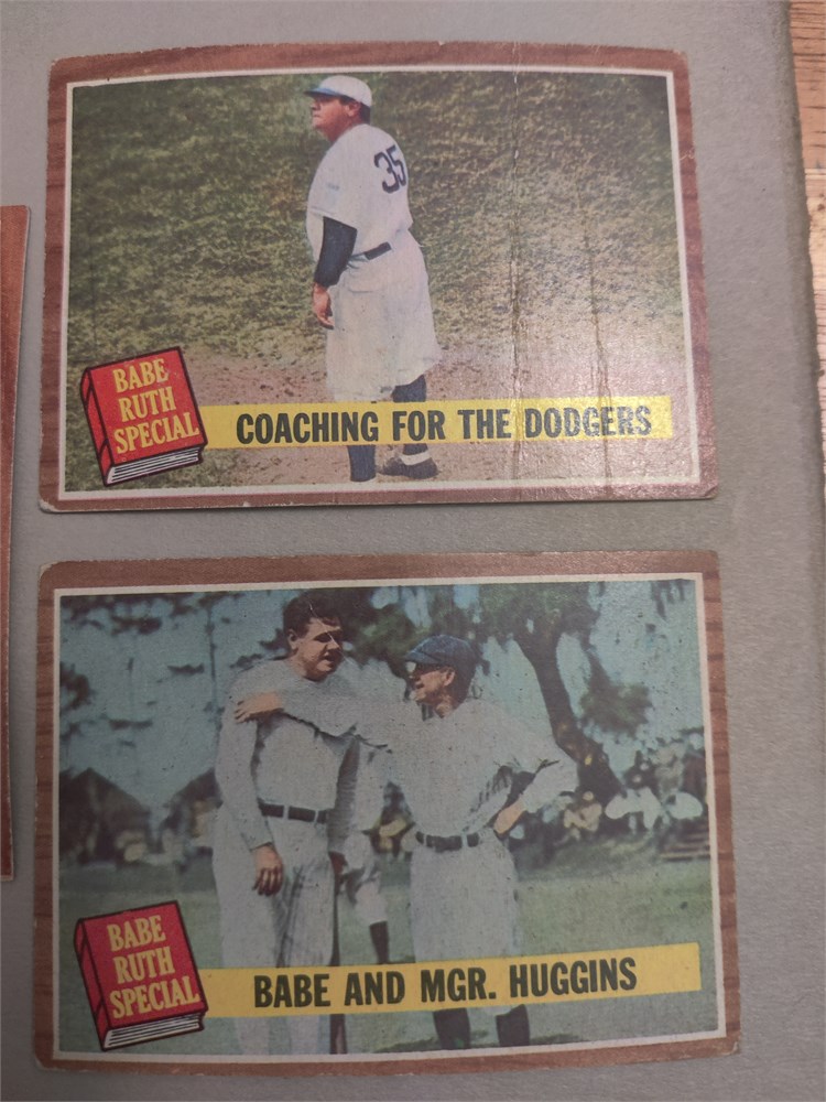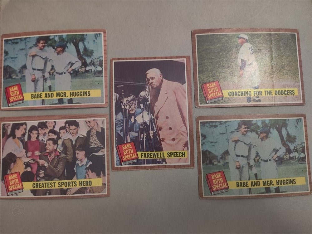 1962 Topps baseball babe Ruth special. These are five cards in a 10 card set that was released with the 1962 Topps baseball cards. All cars are in good condition. There is a duplicate card number 137 Babe and Mgr Huggins.