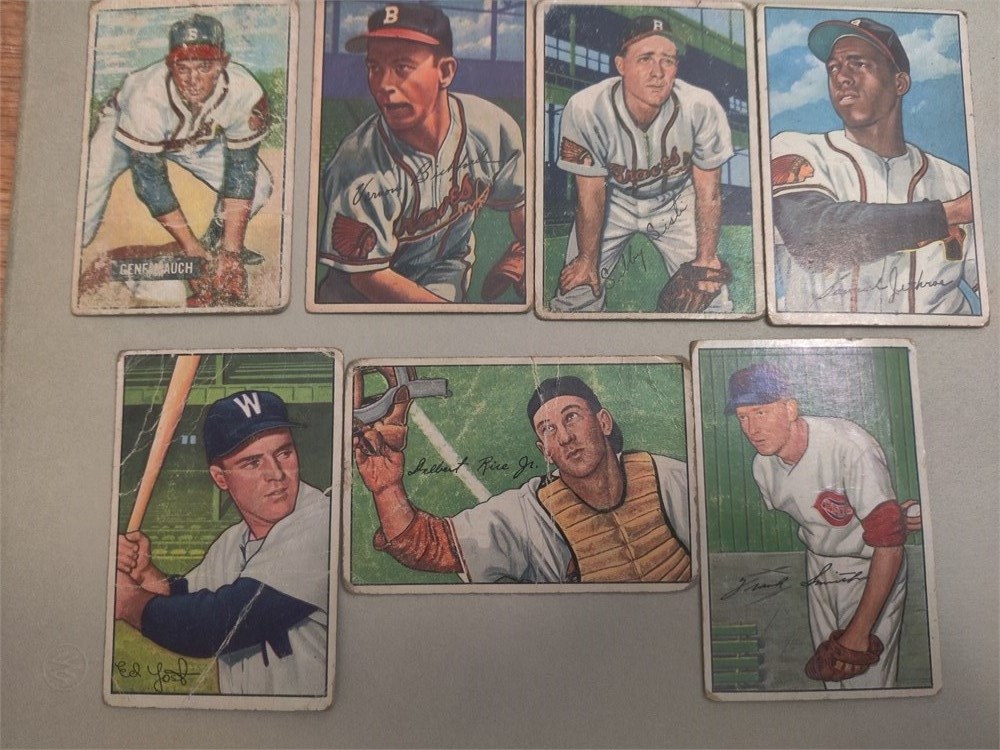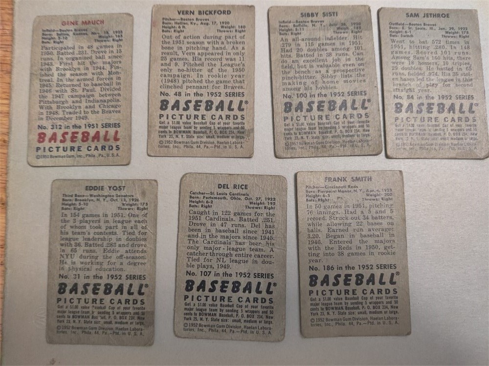 Lot of 7 1952 Bowman baseball cards. Cards vary in condition. Please see pictures. One card is actually 1951.