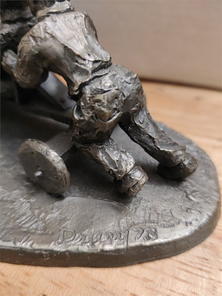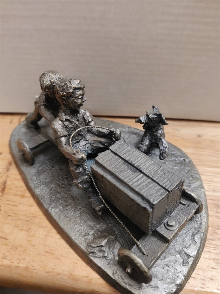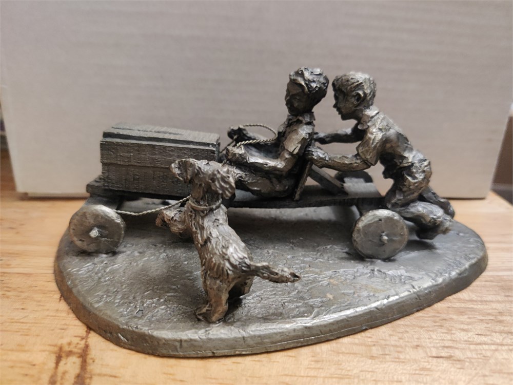 Vintage International Pewter Soapbox Boys and Dog Playing Sculpture Robert Drury.