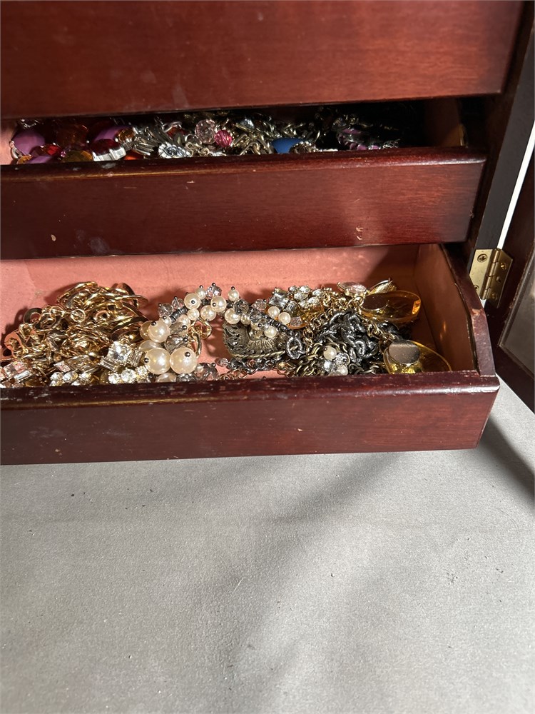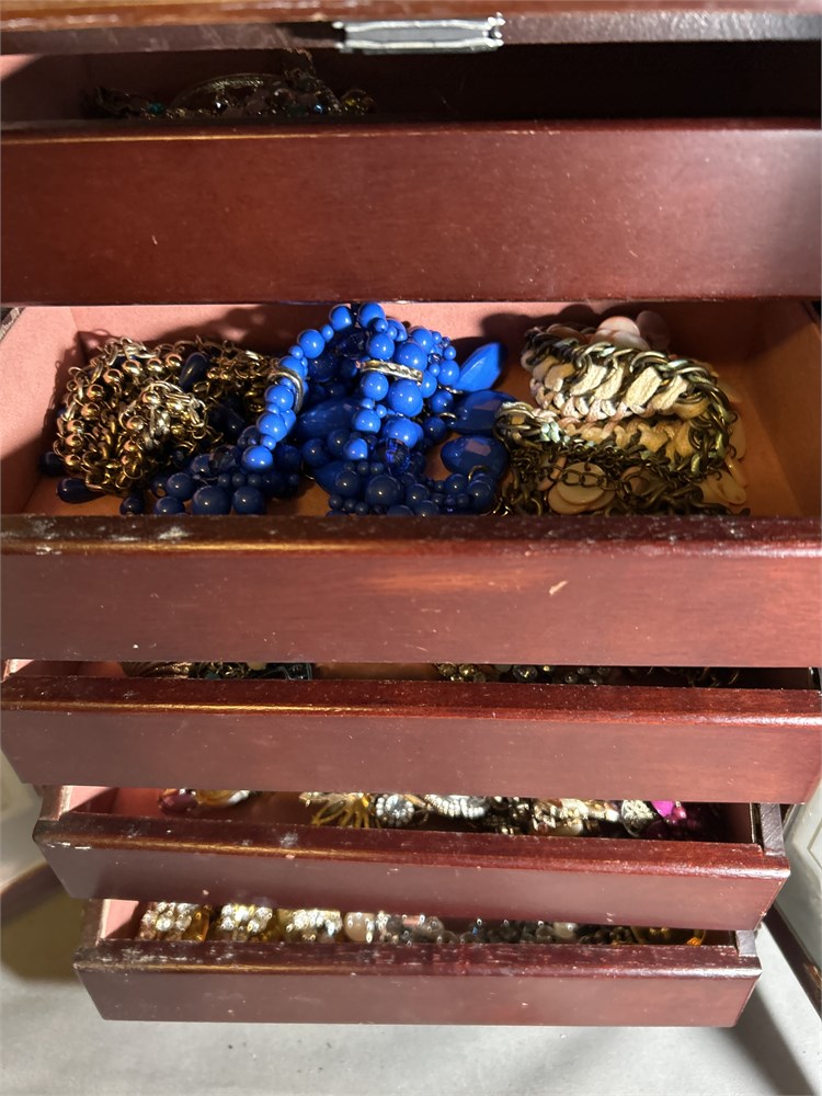 Assortment of jewelry in wood jewelry box (L)