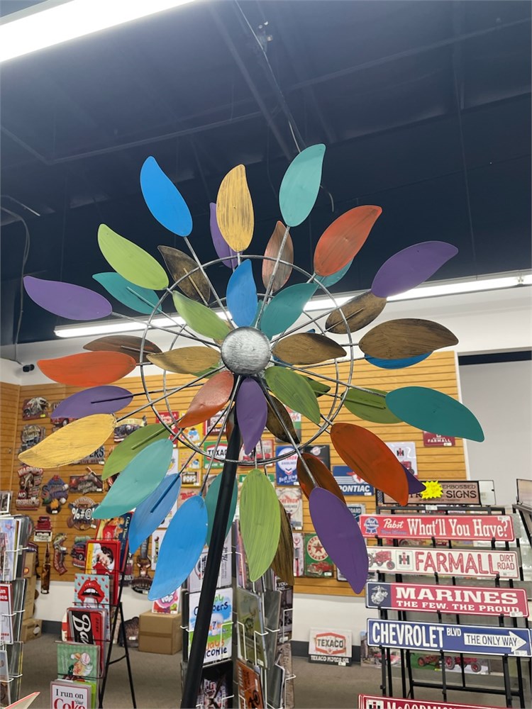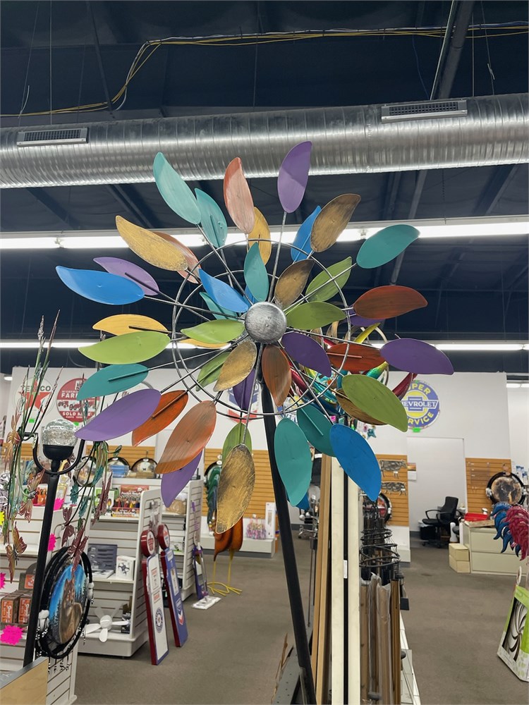 A large metal wind spinner with solar light in a kaleidoscope of colors!  It measures 24" in diameter and stands 84" in height and comes with the stake.  It has never been used and comes in the original box.  The box has been re-taped at the bottom.   A beautiful addition to your backyard or garden!