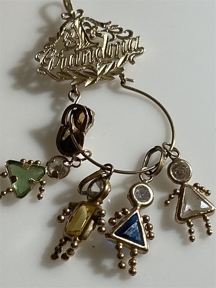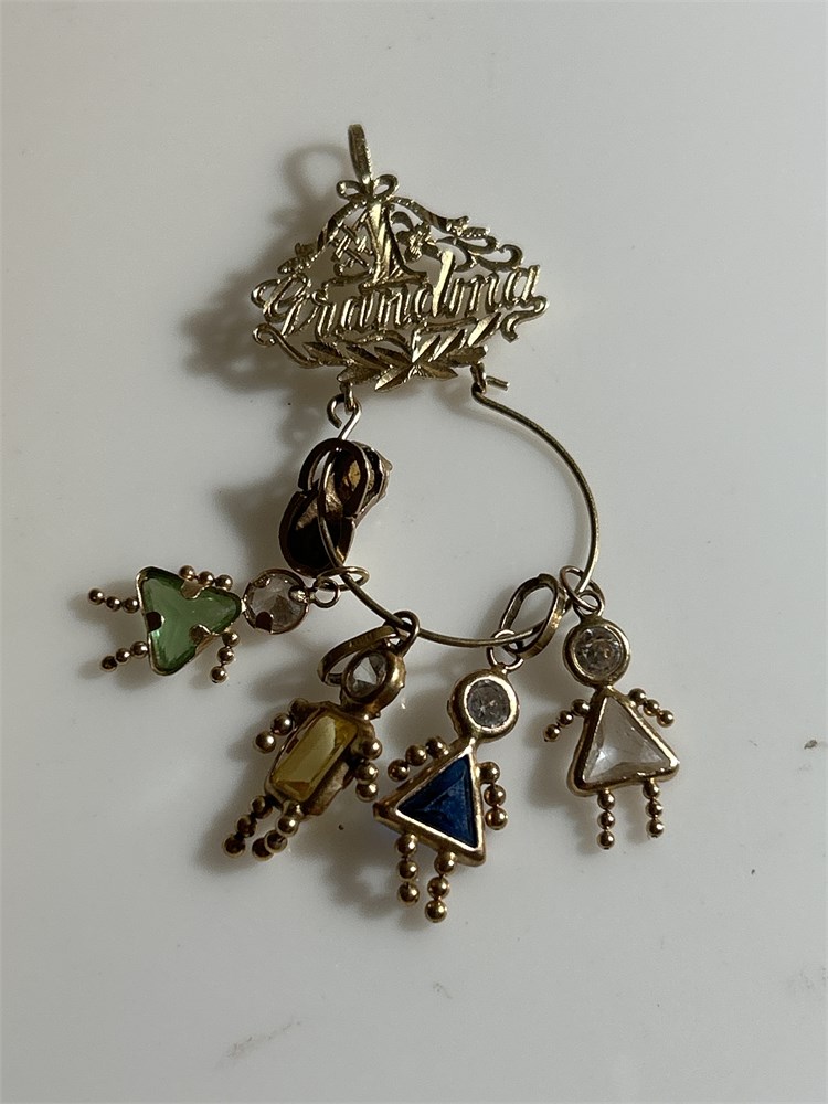 14 karat gold charm five different charms on it looks to be four little women in a shoe Greenstone bluestones White stones 4.68g