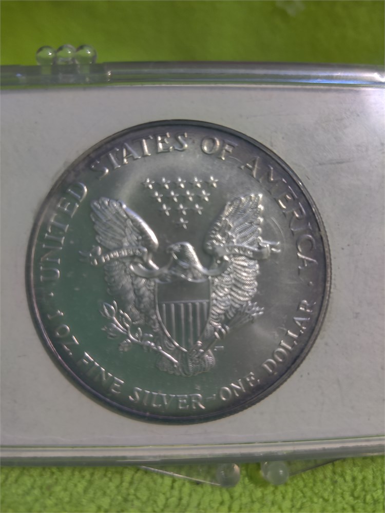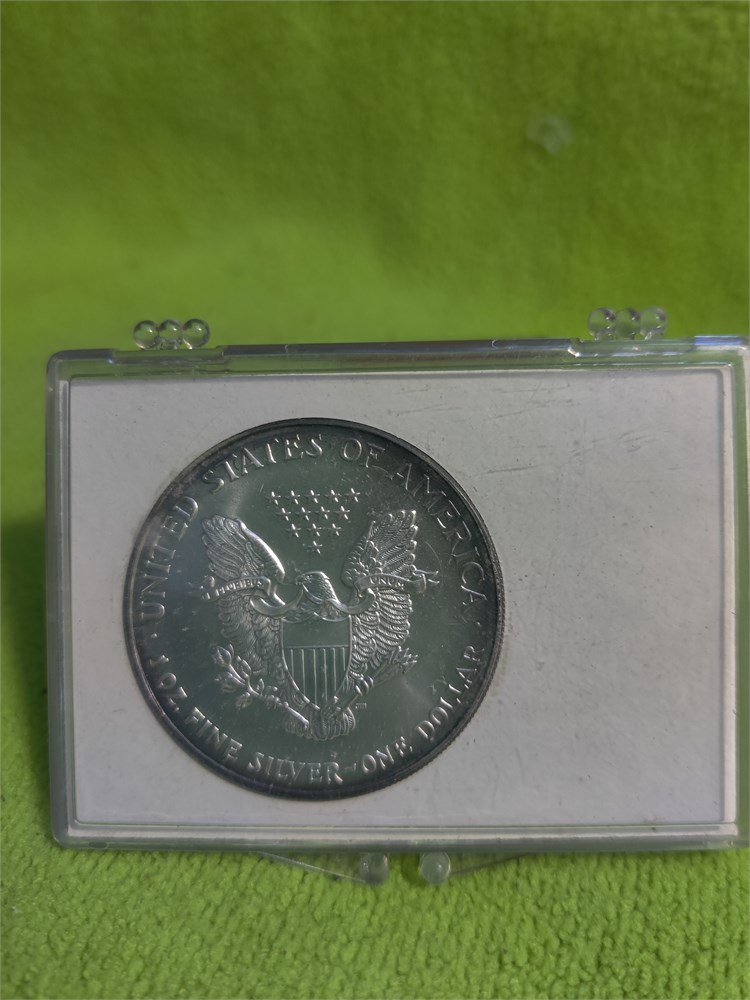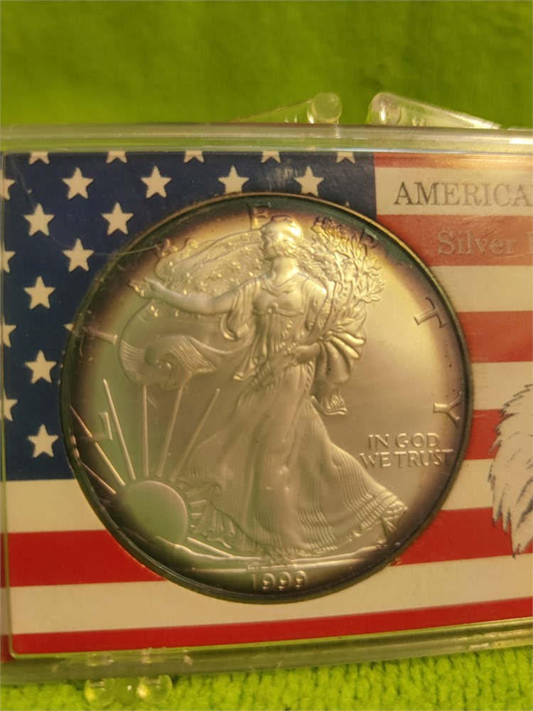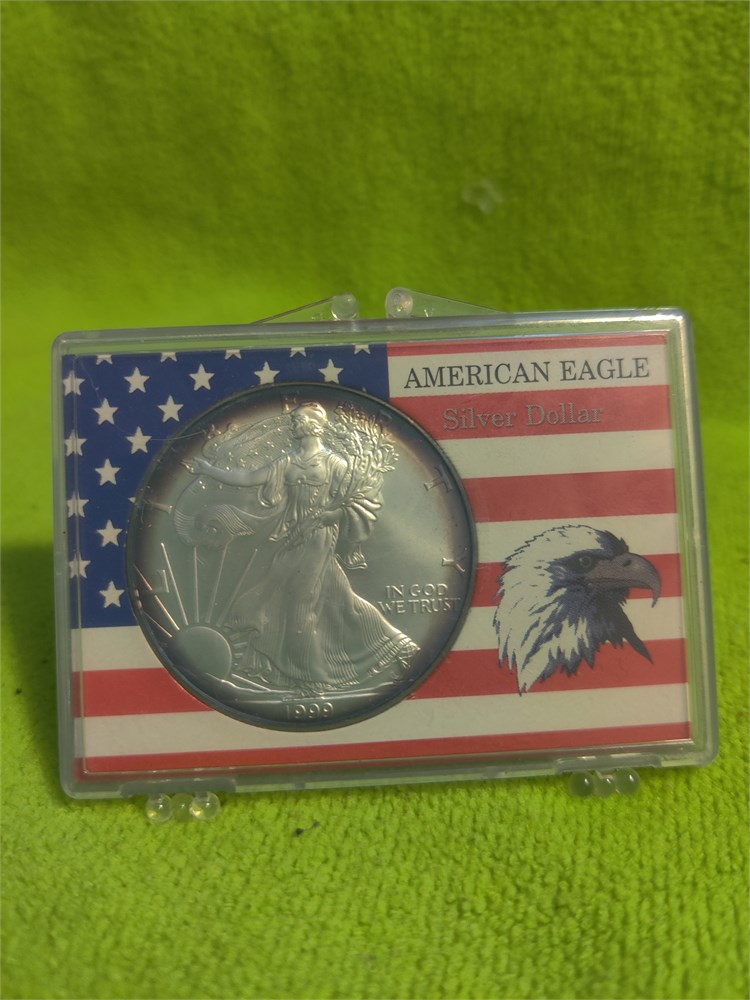1999 American Eagle 1 oz silver coin. Coin comes in plastic case. There is some toning around the outer edges of coin.