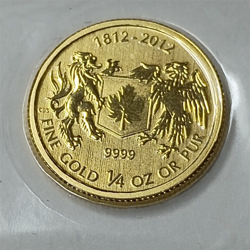 • Reverse: Heraldic design featuring a British lion and American eagle flanking a shield bearing a maple leaf, with dates 1812-2012 and inscriptions CBS 9999 FINE GOLD ¼ OZ OR PUR. Liberty Coin+3Numista+3Coins Catalog+3