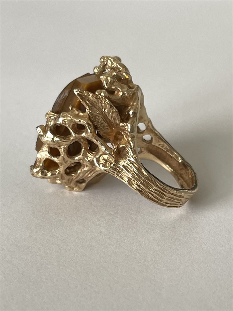 A 14K yellow gold ring with eye-catching Brutalist styling including stark branches and a leaf or two.  The setting is a carved double cameo made from tiger's eye stone.  Size 7.  Marked 14K and also tested to confirm.
