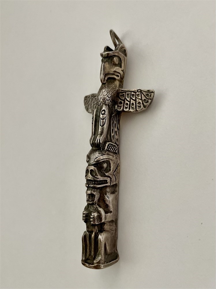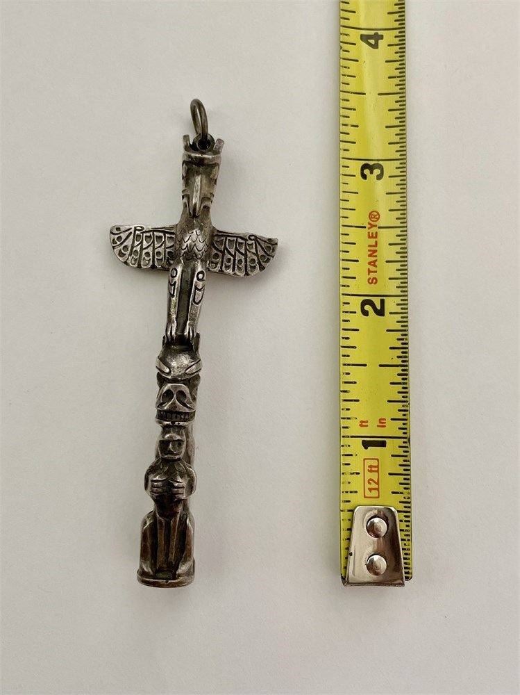 This totem pendant is a rare piece by Henryk Winograd, a master of traditional silversmithing techniques.  It's marked: "HW 999" and is 999/1000 silver.  This pendant is a full totem pole, not a small version, with 3.25" length.