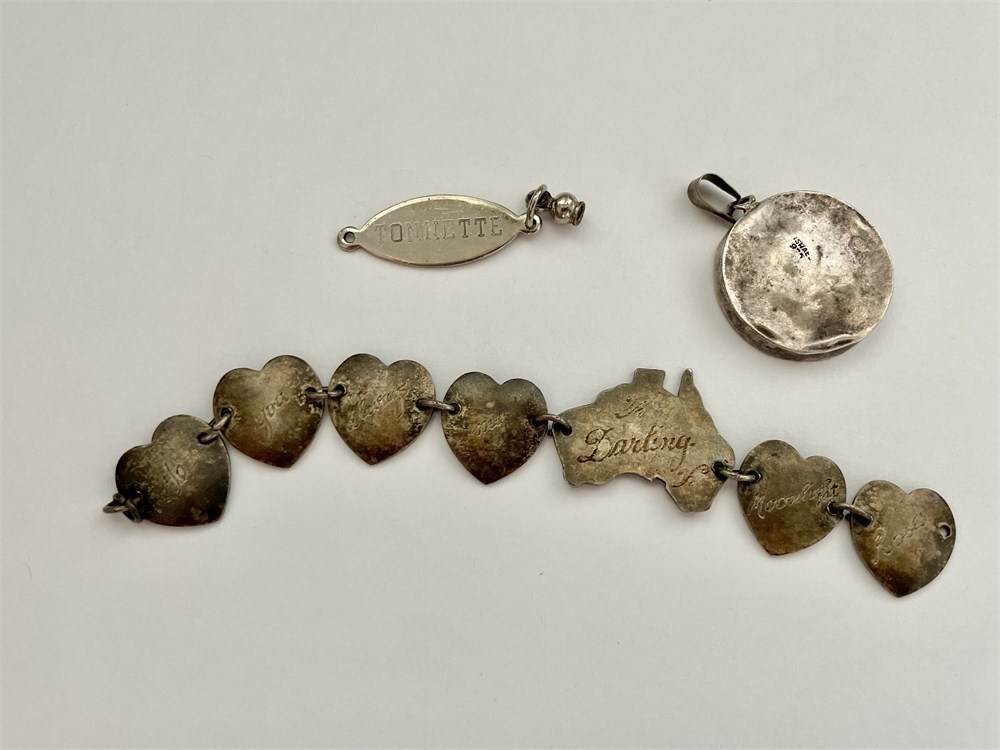 Other items in the lot are extra silver parts: an Israel 925 mounting, a "Tonette" component marked Sterling, and an unmarked (silver?) Australia souvenir bracelet engraved with romantic phrasing.