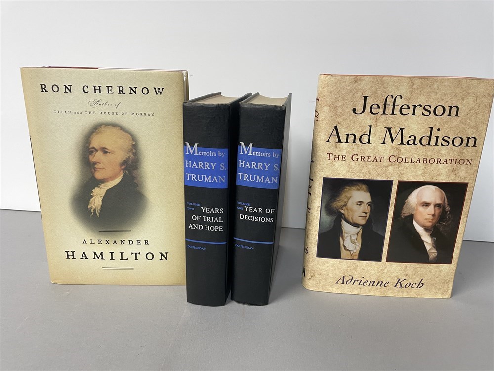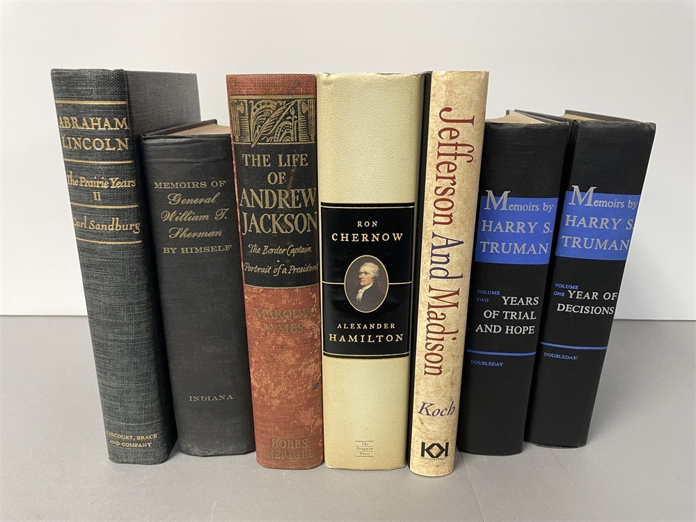 Books on historical American leaders.  Two volumes are memoirs of Harry S. Truman.  One is memoirs of Gen William T. Sherman, by himself.  Other subjects are Andrew Jackson, Abraham Lincoln, Jefferson, Madison, Alexander Hamilton.