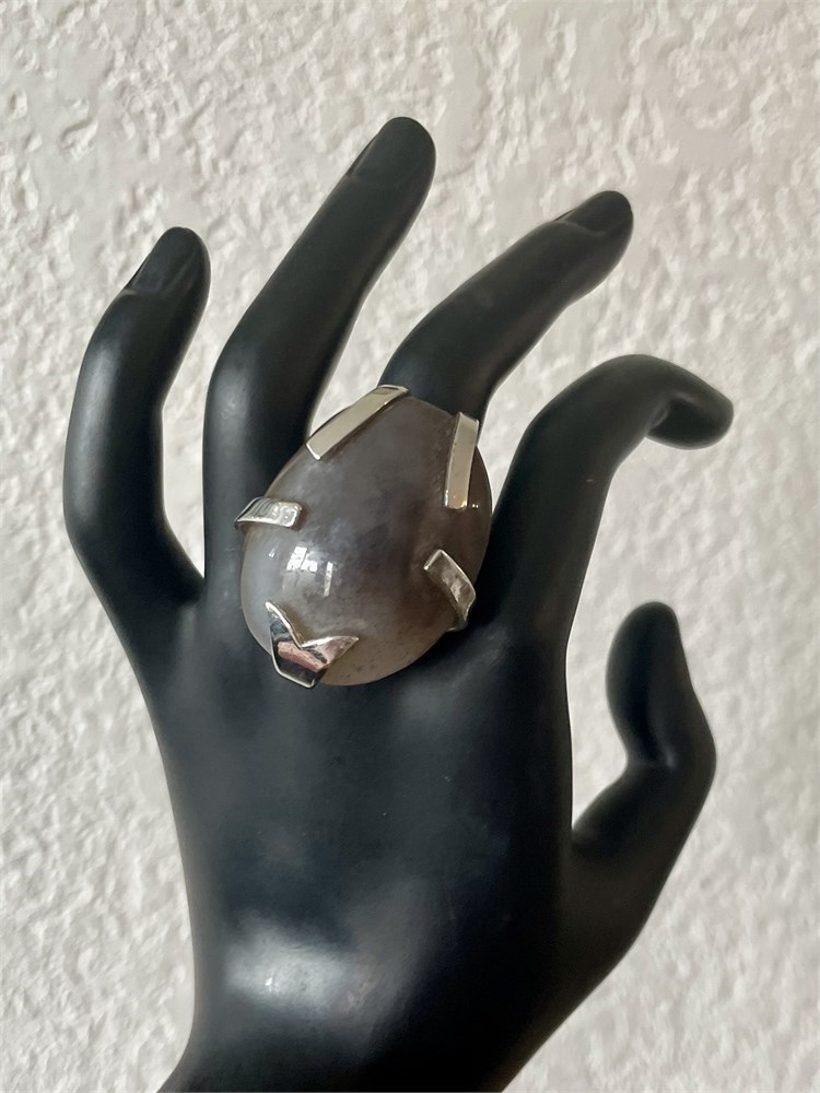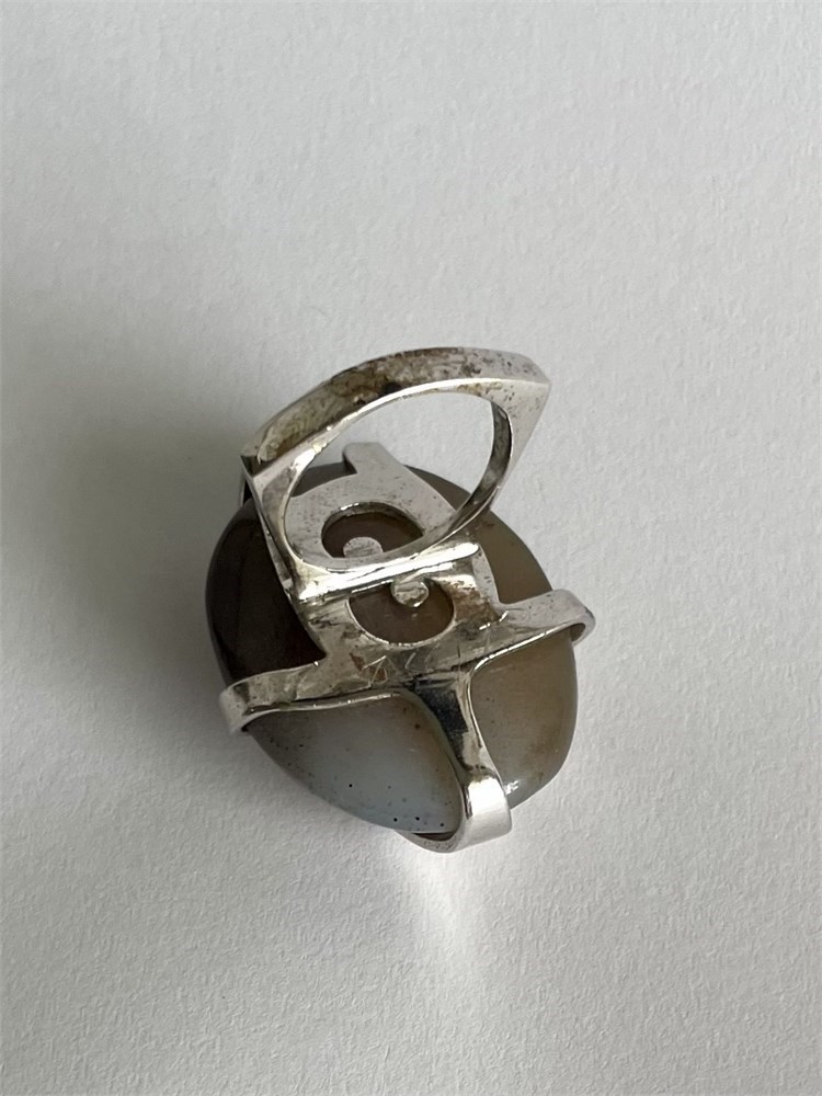 A large stone in a silvertone setting, unusual style.  Size 8.
