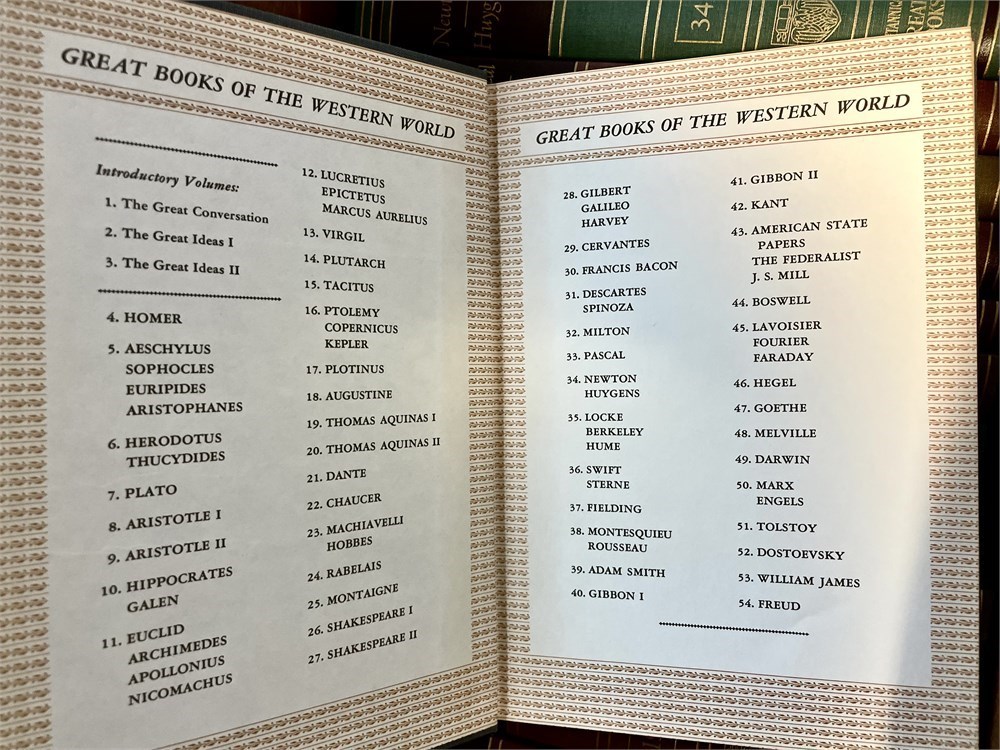 Includes introductory volumes (1-3) and 46 volumes of the writings of foundational thinkers of the Western World, essentials for a liberal education, by Encyclopedia Brittanica.
