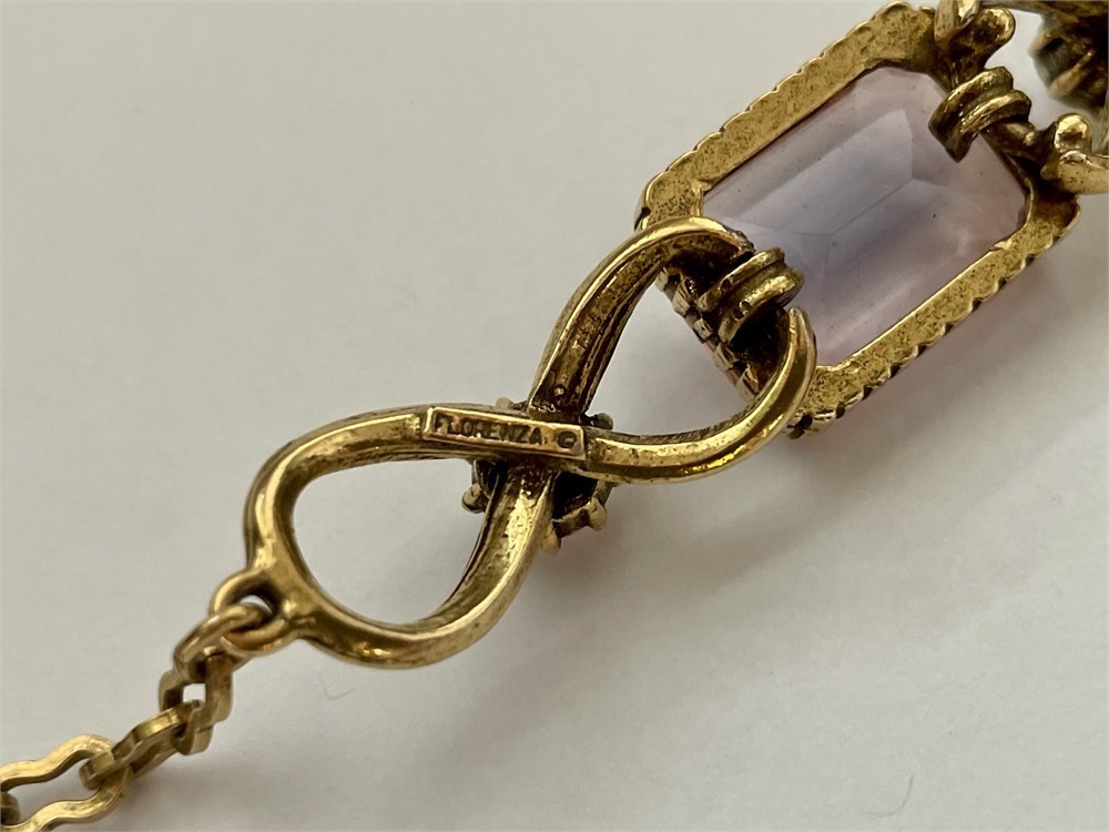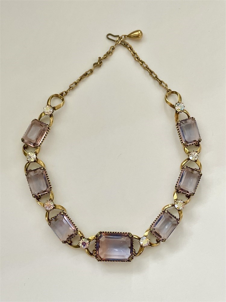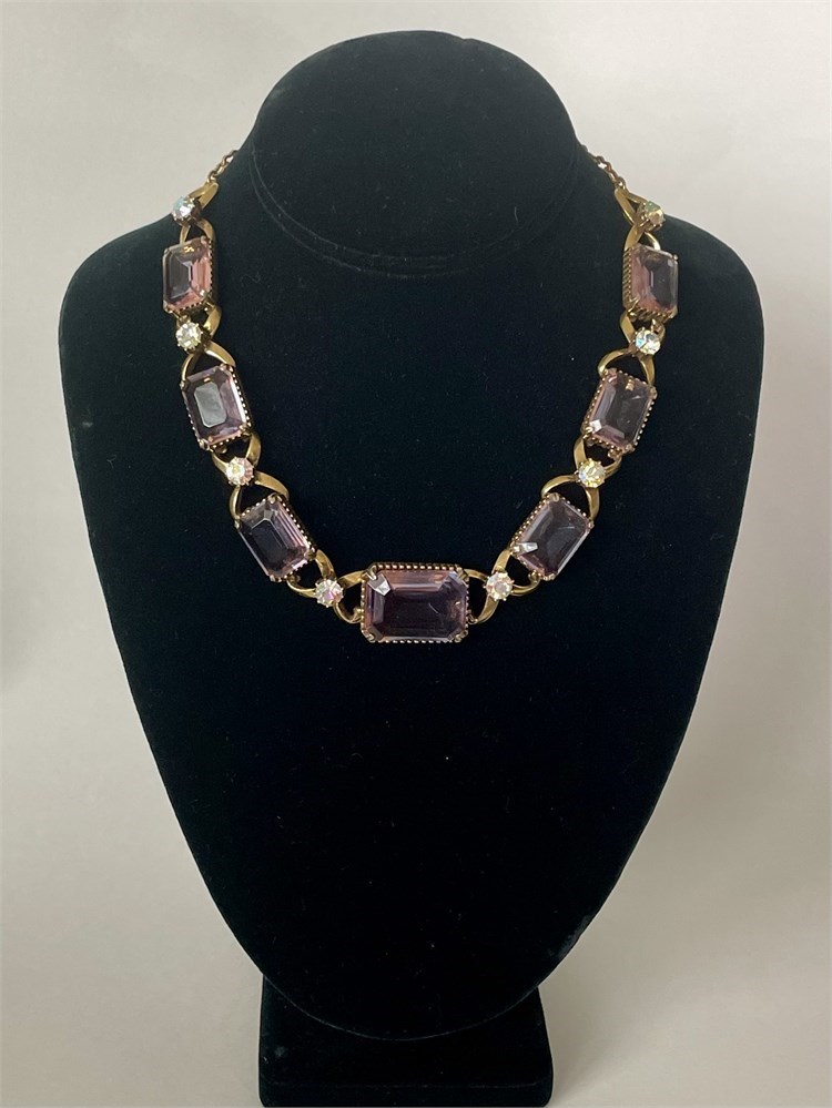 Here's a beautiful vintage statement necklace - the stones are a light purple or amethyst color with hints of pink and blue.  Accented with smaller rhinestones too, in a goldtone setting.  Signed Florenza.