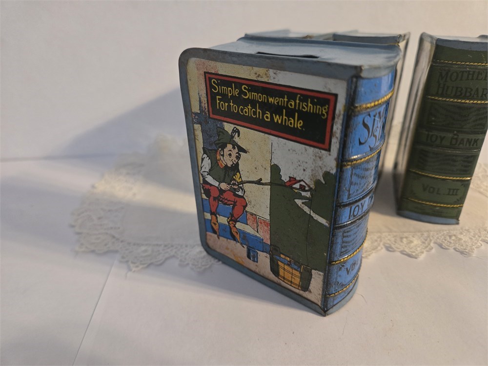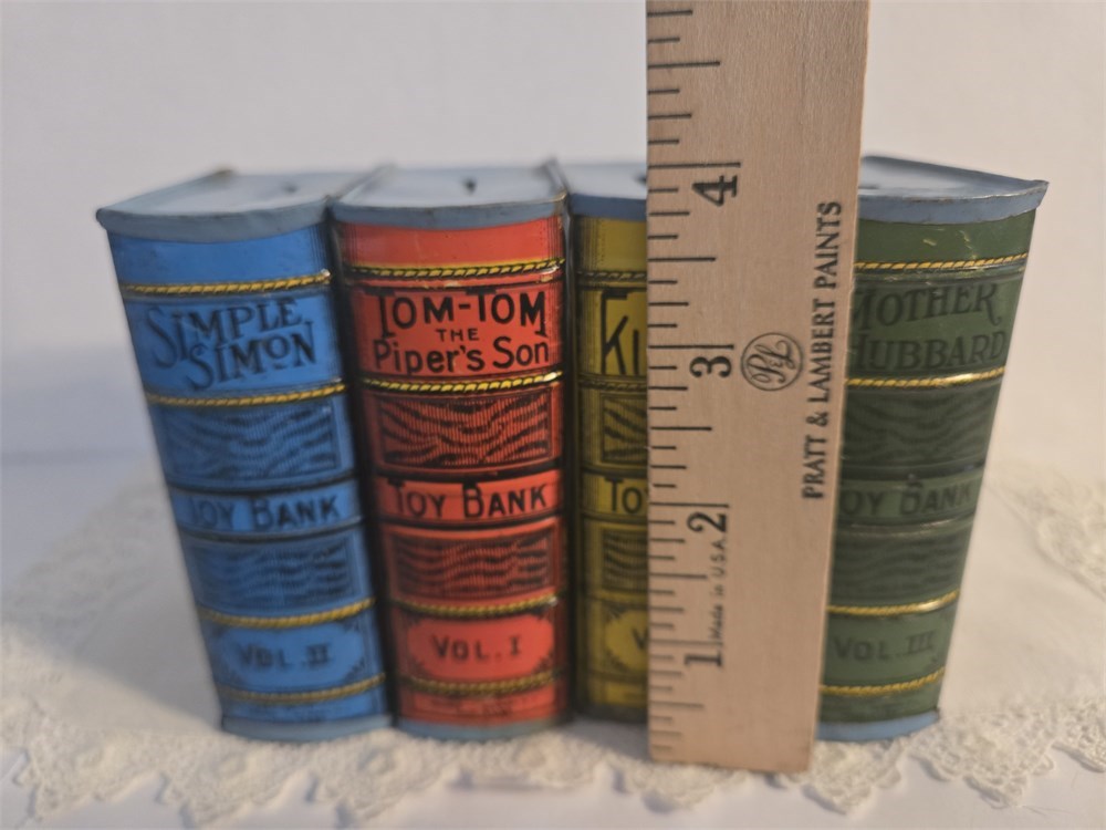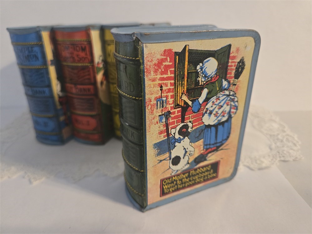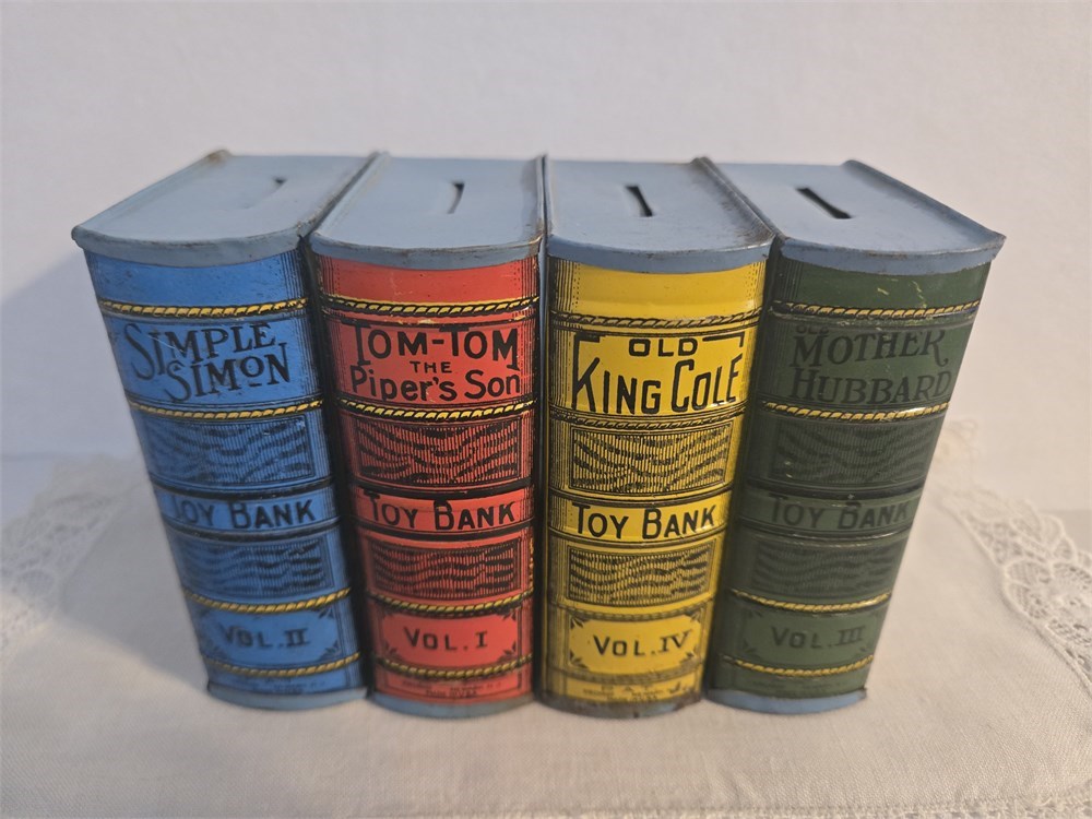 Lot of 4 Antique Tin Lithograph Toy Banks – “Nursery Rhyme Book” Series