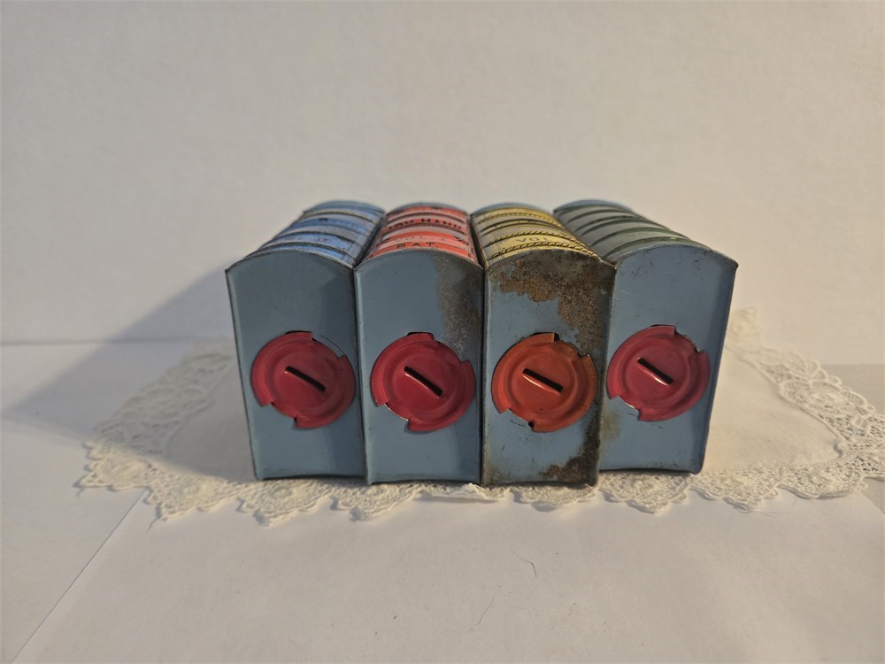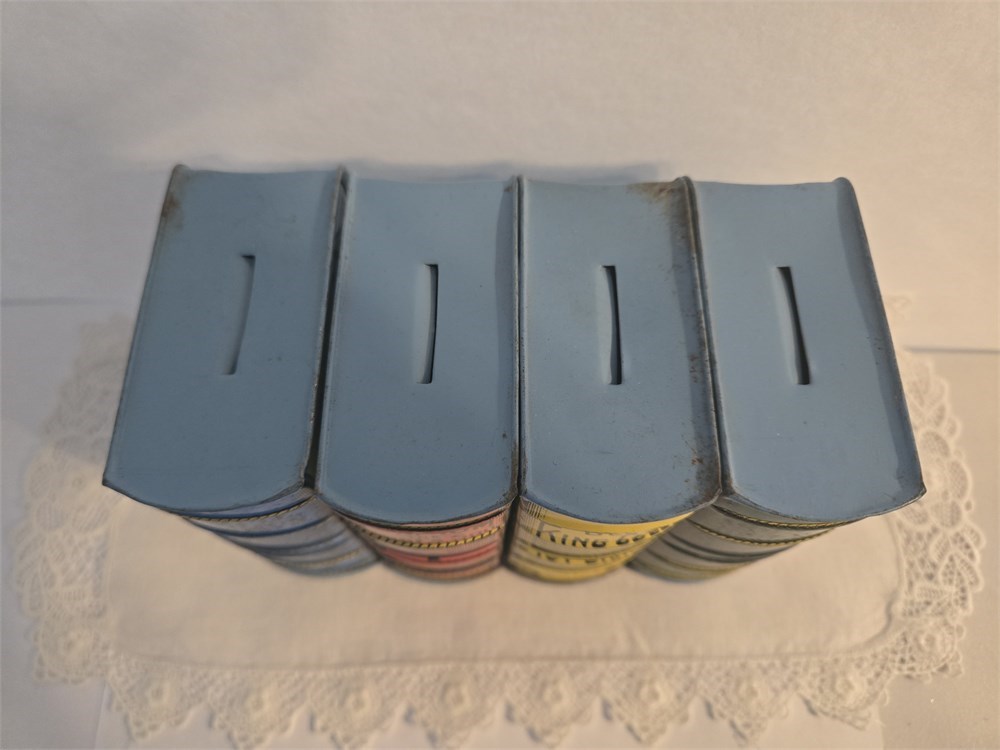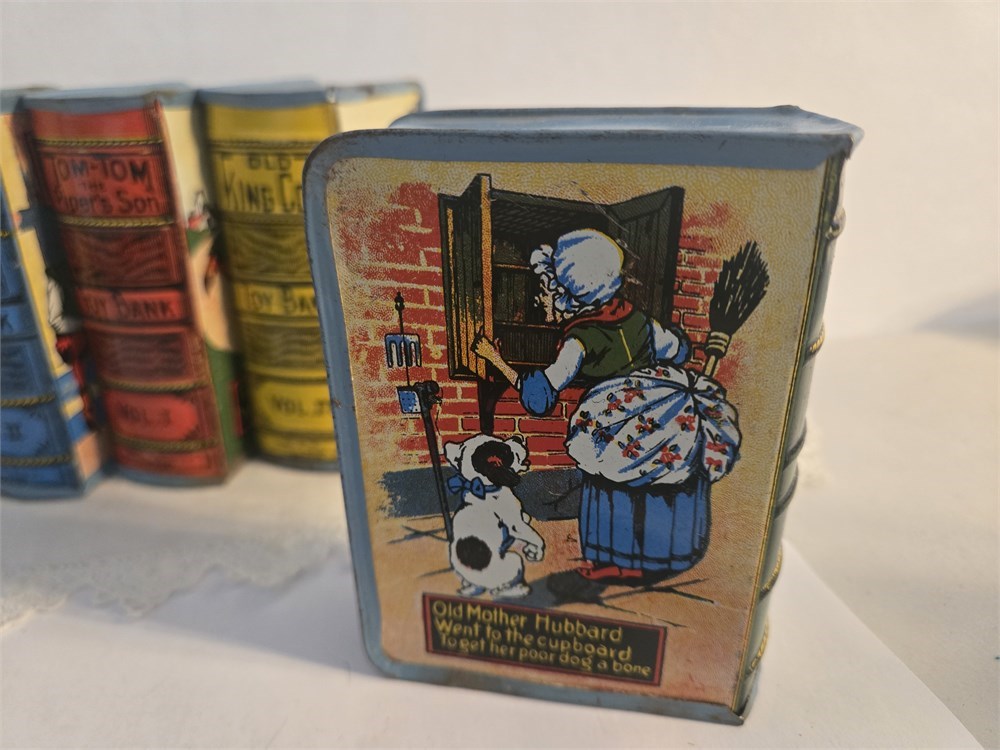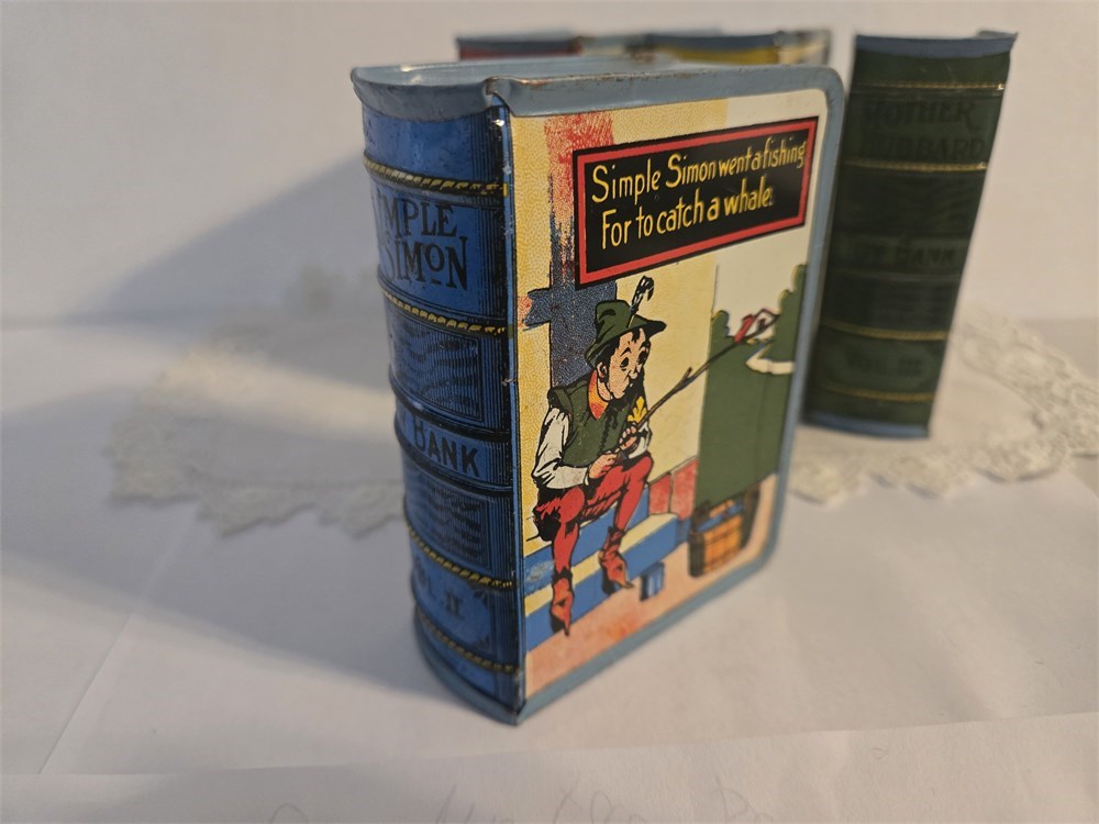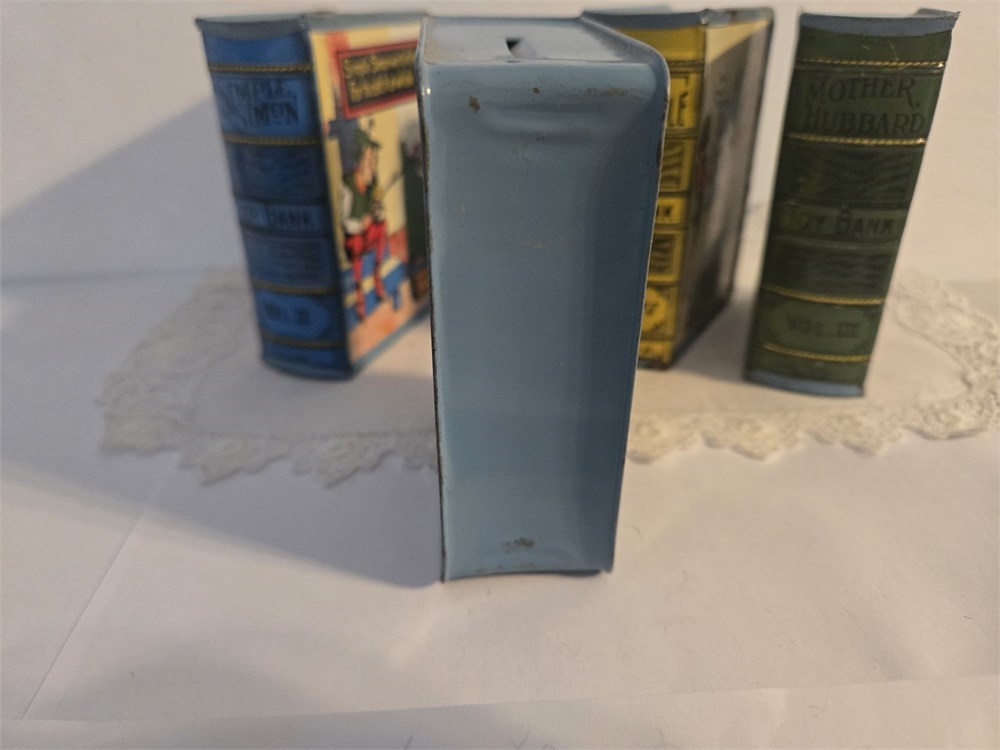 Lot of 4 Antique Tin Lithograph Toy Banks – “Nursery Rhyme Book” Series