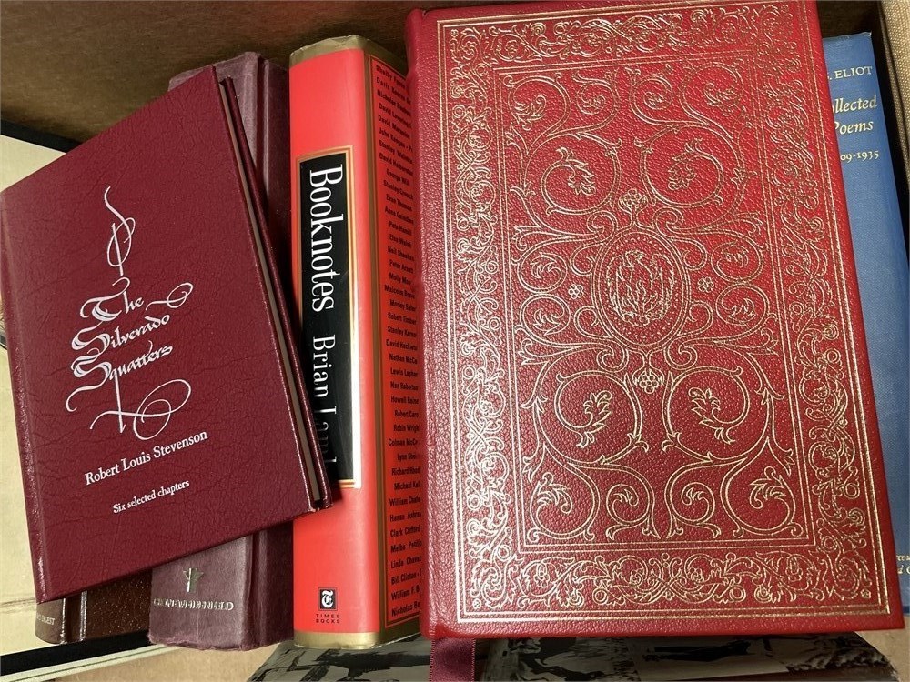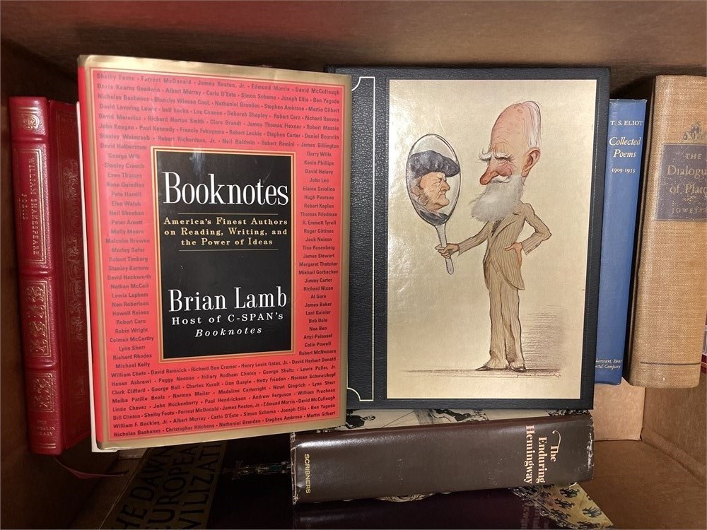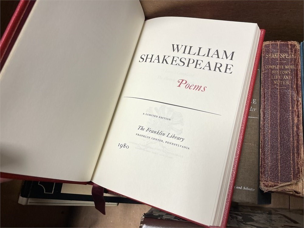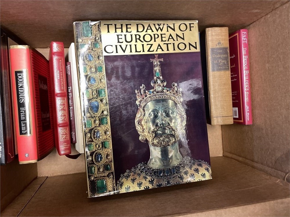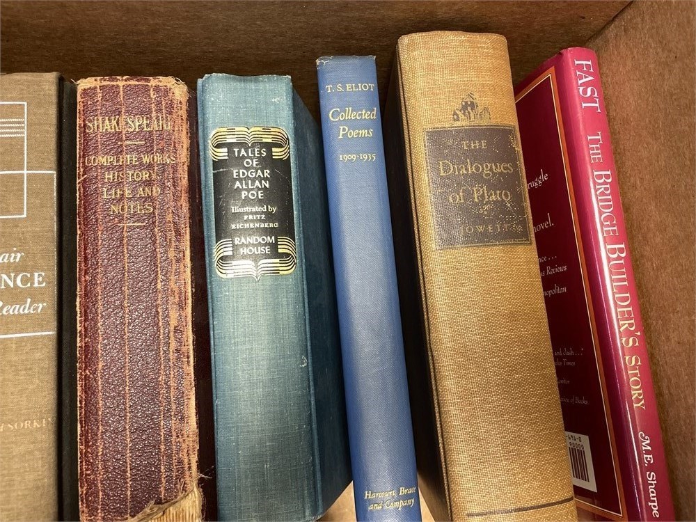 15 assorted books.  Shakespeare from Franklin Library, a Shaw play, Plato, Poe, European Civilization oversized book, Hemingway, others.