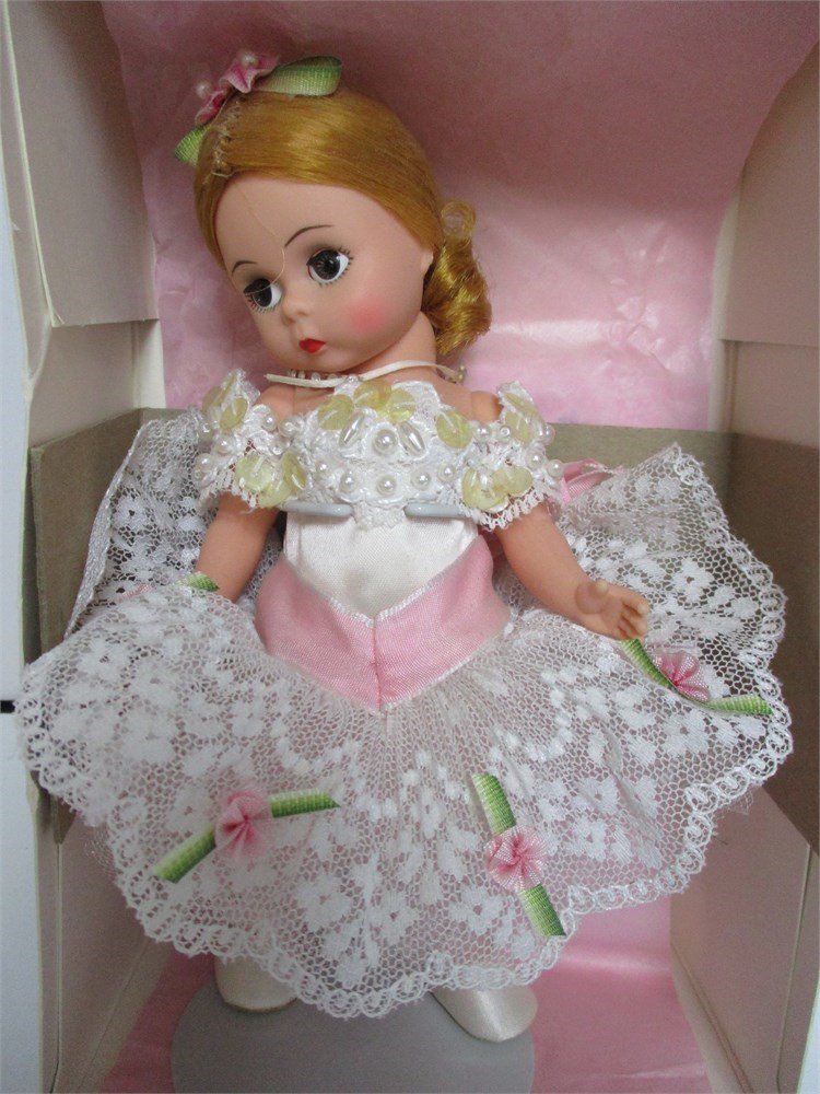 This charming Madame Alexander doll from The Ballet Collection features Wendy as a ballerina. She is dressed in a delicate pink satin and lace tutu, adorned with tiny green and pink ribbon rosettes. Her outfit is completed with satin ballet slippers and a flower accent in her blonde hair. The doll has her original hangtag attached and is presented in her original Madame Alexander box with pink tissue paper.