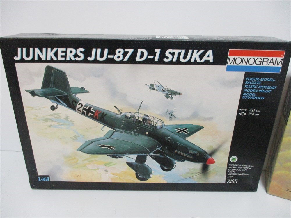 • Monogram Junkers JU-87 D-1 Stuka (1/48 scale) – Classic WWII German dive bomber kit with detailed parts.