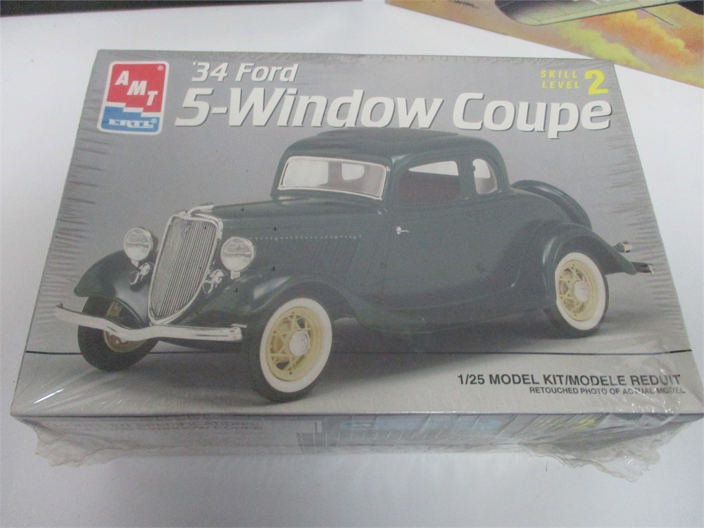 • AMT 1934 Ford 5-Window Coupe (1/25 scale, Skill Level 2) – Unopened, Vintage American hot rod car kit featuring V-8 engine detail, optional parts, and chrome accents.