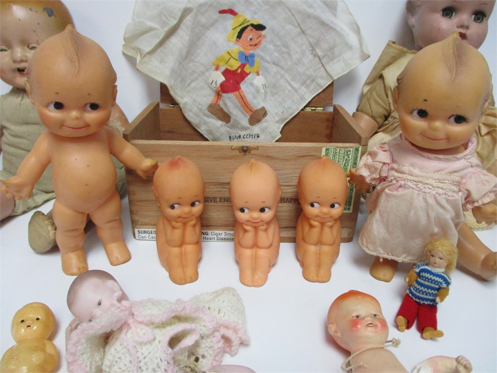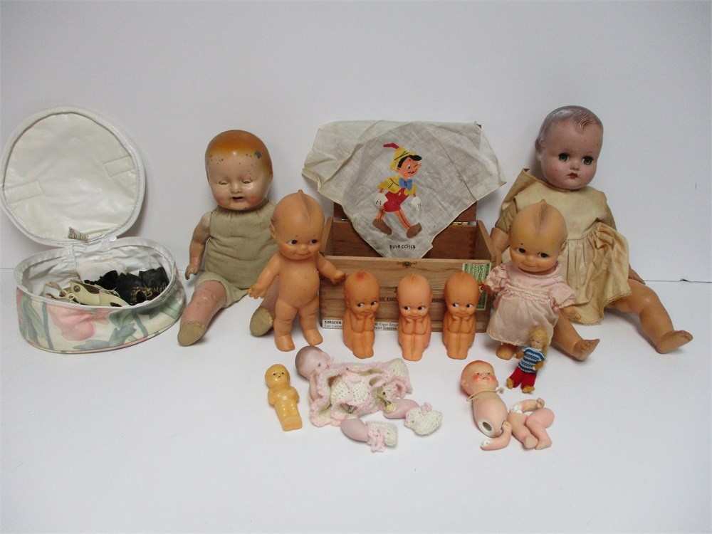 This charming mixed lot includes a variety of vintage and antique dolls, ranging from early composition dolls to classic Kewpie figures. A great assortment for restoration projects, collectors, or resale.