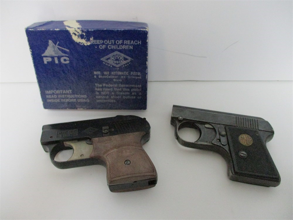 Offered here are two vintage blank-firing pistols with their original box. These were manufactured as starter pistols / blank guns and are not classified as live firearms.  There is only one box for the PIC.