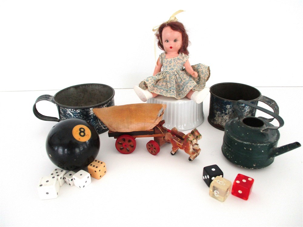 Vintage Collectibles Lot – Toys, Dice, Kitchenware & More