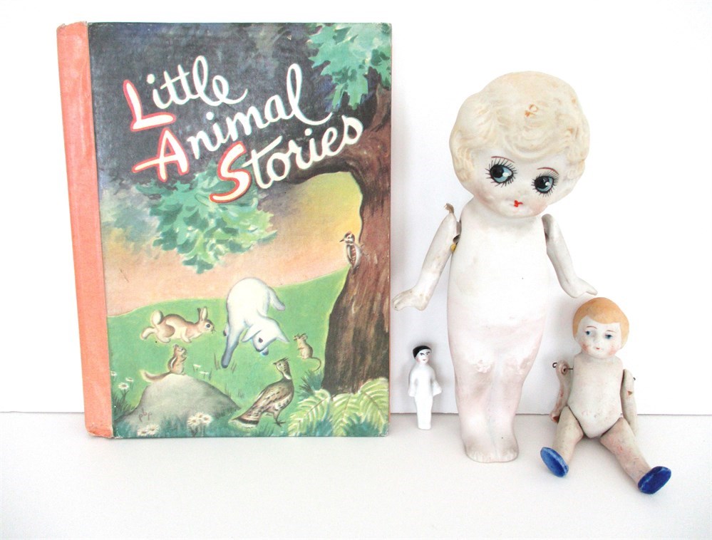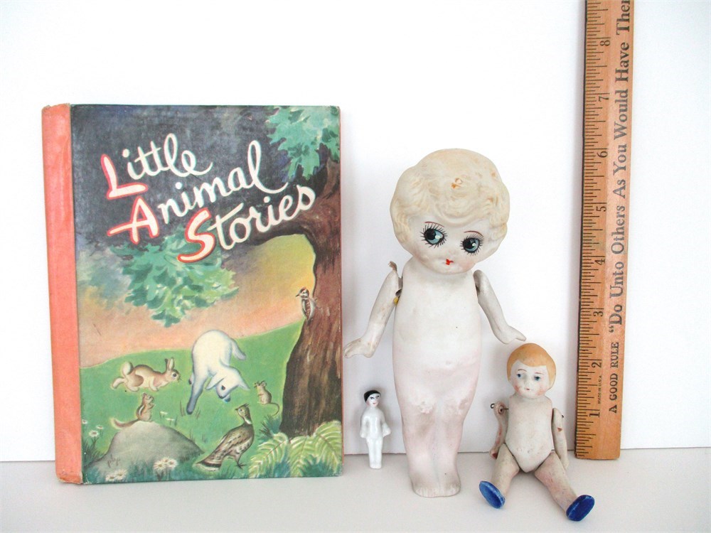 This vintage 4 piece lot consists of a 6" Bisque Kewpie Doll with jointed arms.  She has a sweet sweet face and in great vintage This condition.  The Bisque Baby Boy Doll with jointed arms and legs and in great vintage condition.  A  1.5" Frozen Charlotte Doll, in great vintage condition and a book, "Little Animal Stories, from the The Little Color Classics.  The Book is in very nice vintage condition, pages complete and clean !