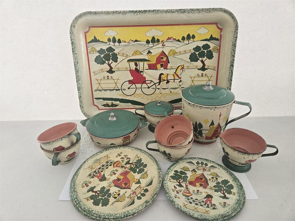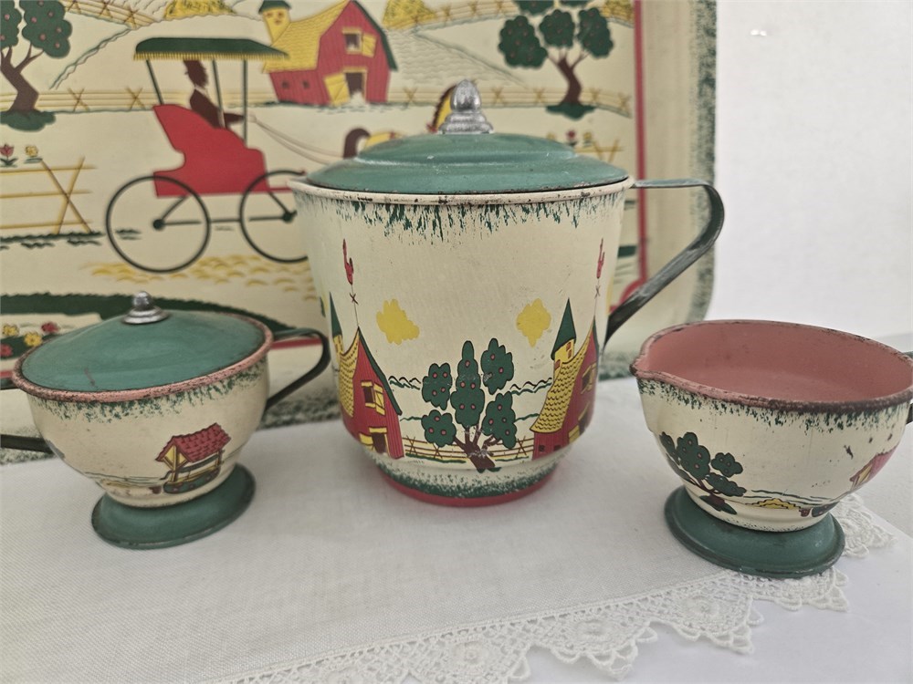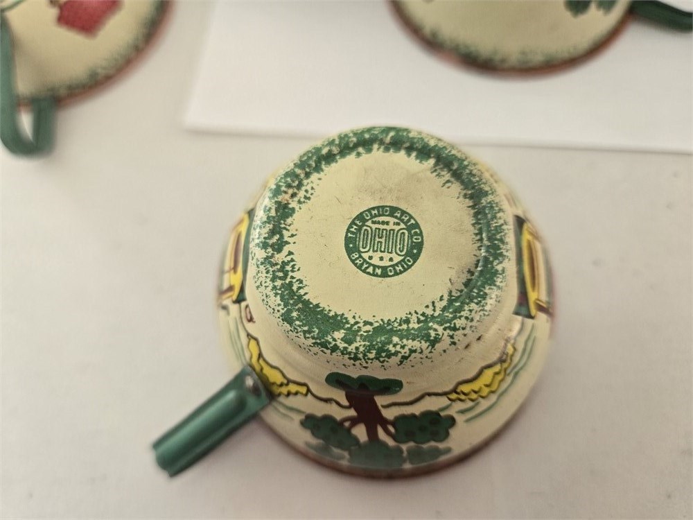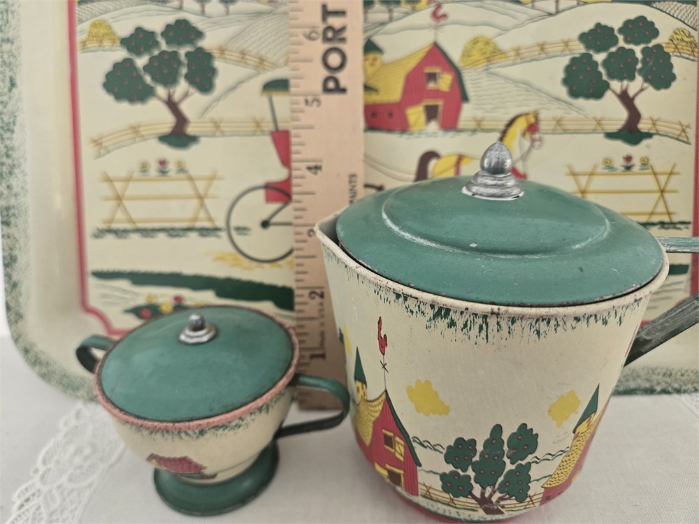 Charming complete tin lithographed toy tea set made by the Ohio Art Company (Bryan, Ohio), circa 1940s–1950s. The set features delightful farm and country scenes with bright colors including red, green, and yellow, showing cottages, horse-drawn carriages, and playful figures.