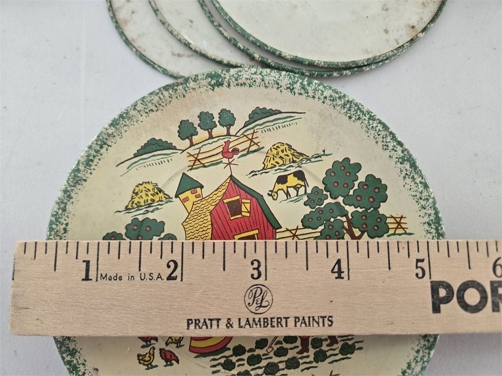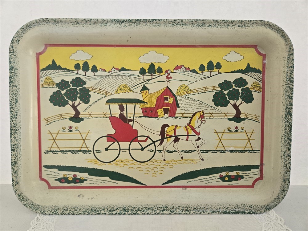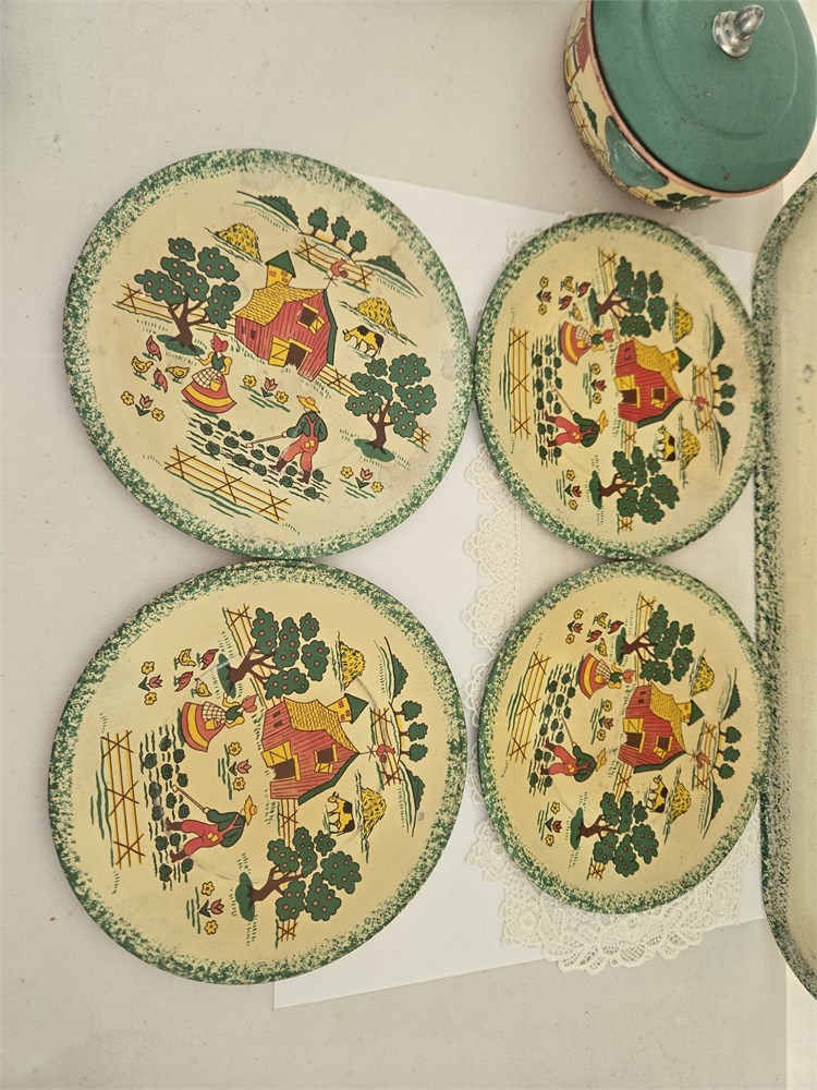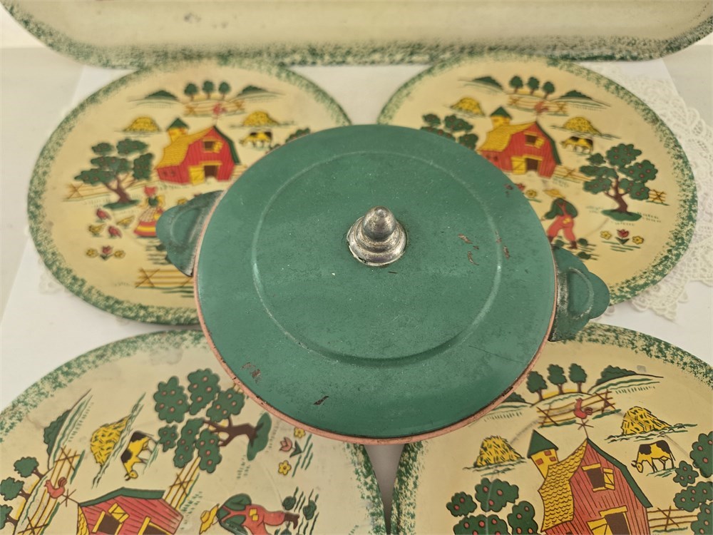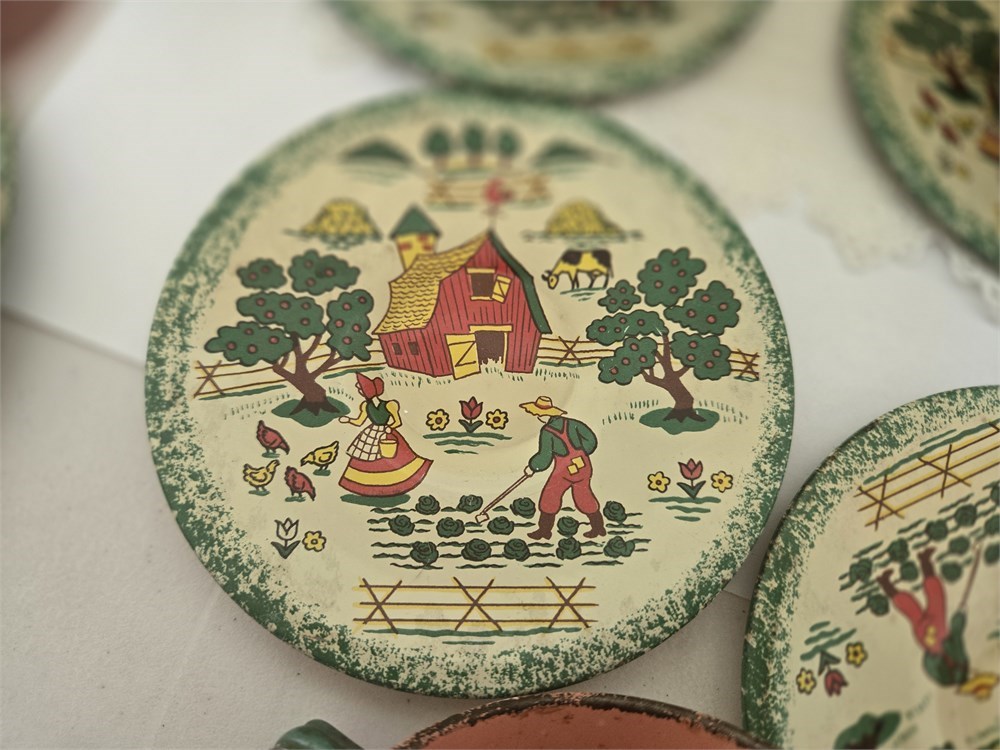 Charming complete tin lithographed toy tea set made by the Ohio Art Company (Bryan, Ohio), circa 1940s–1950s. The set features delightful farm and country scenes with bright colors including red, green, and yellow, showing cottages, horse-drawn carriages, and playful figures.