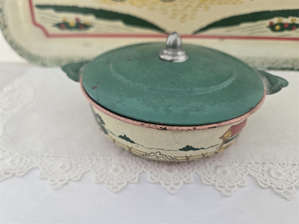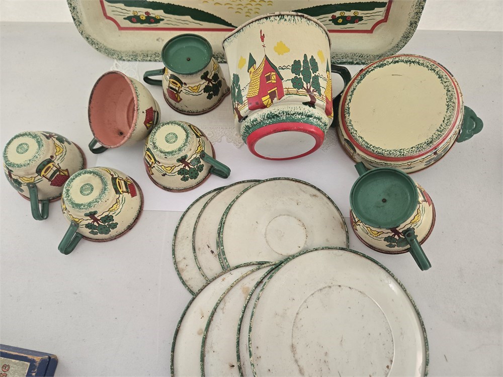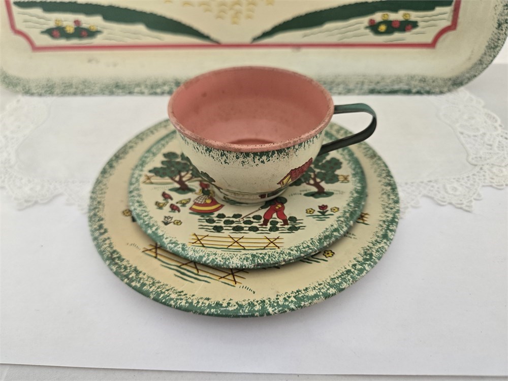 Vintage 1940s Ohio Art Co Tin Lithographed Children’s Toy Tea Set & Tray DISHES