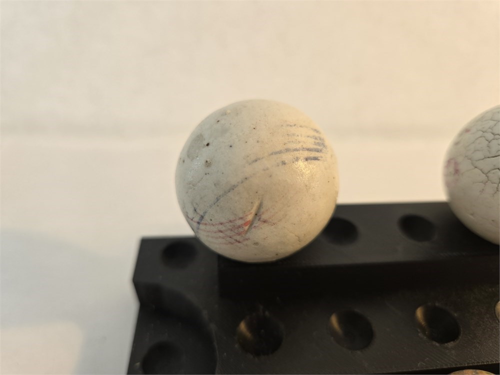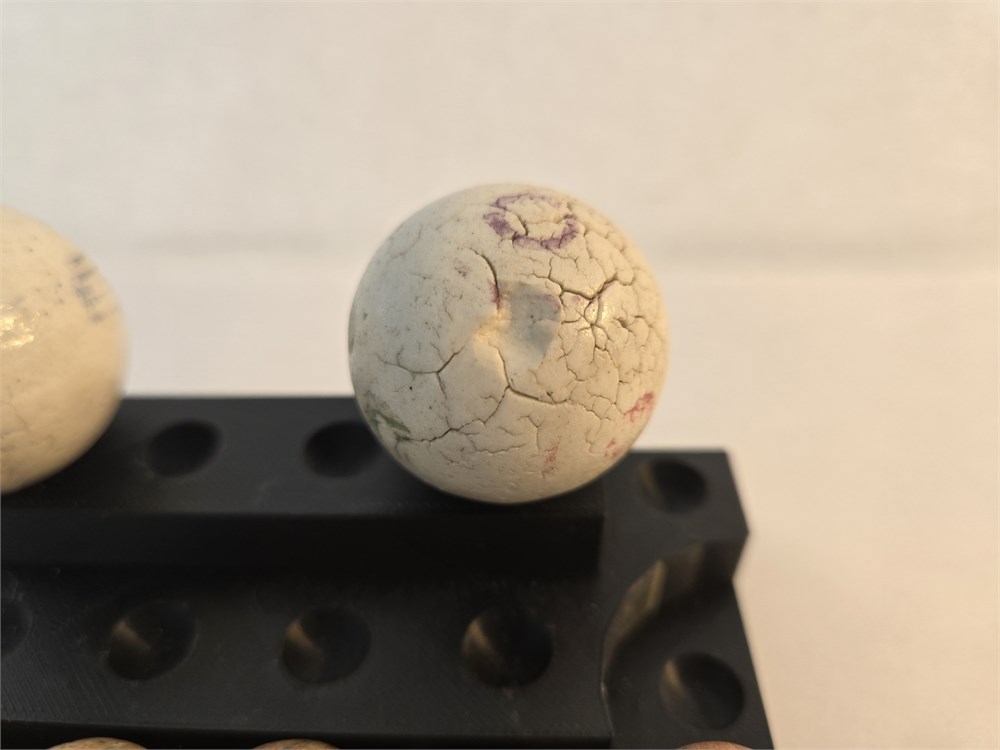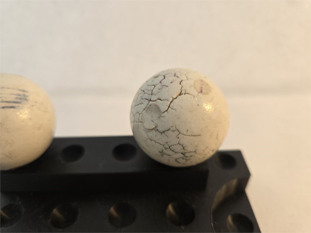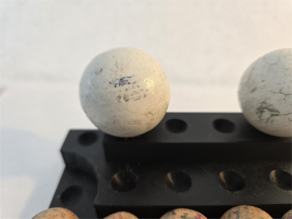 • Two larger clay marbles (approx. 1" diameter each): one whitewashed with faint purple/blue surface staining, the other with natural tan coloration and subtle striping.