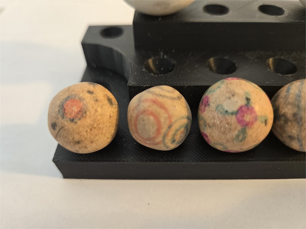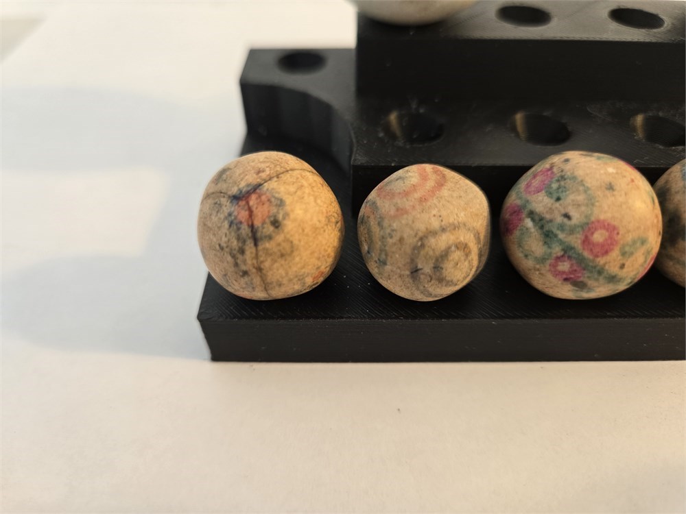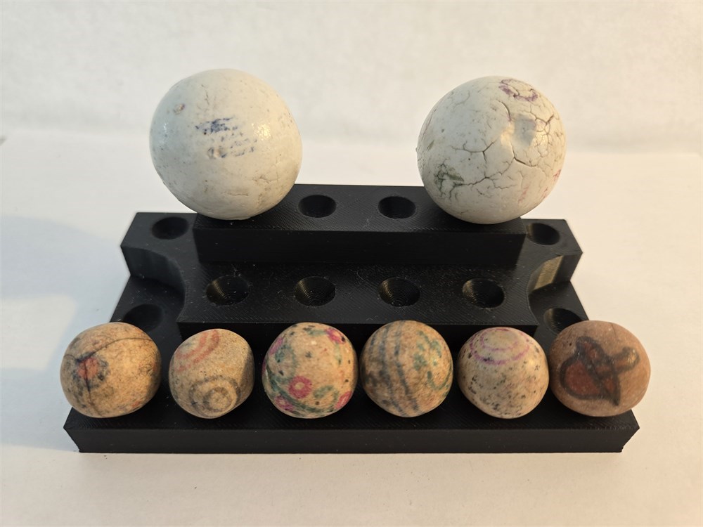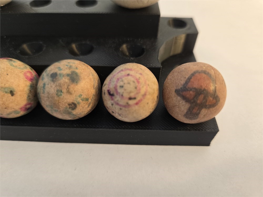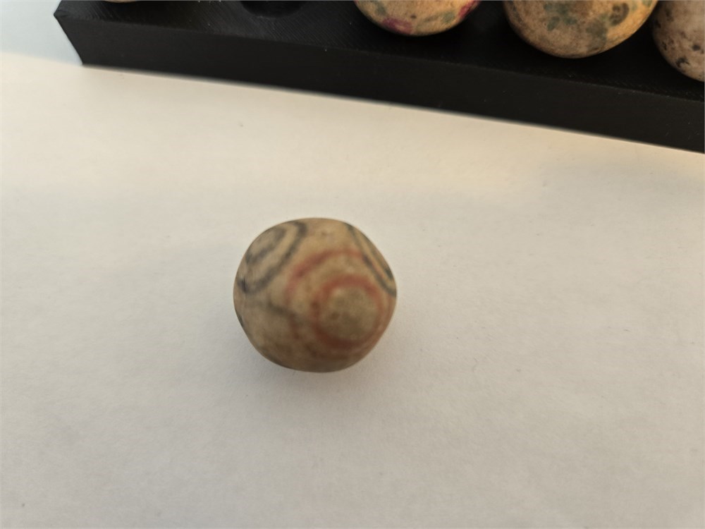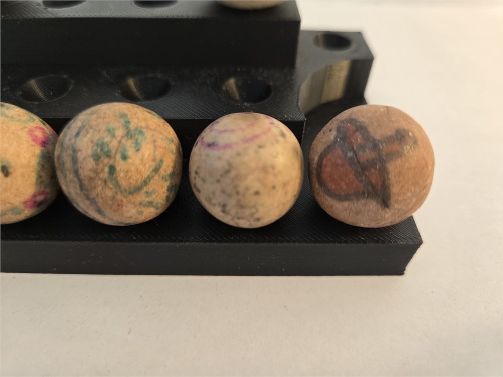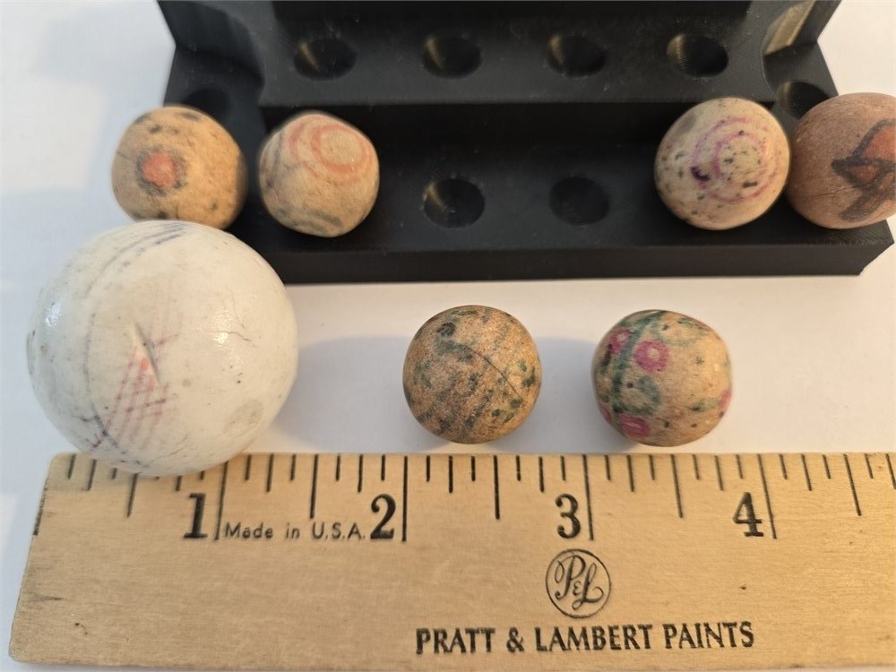 • Six smaller clay marbles (approx. ½"–¾" diameter each): featuring mottled surfaces, concentric target-style rings, and traces of hand-applied pigments in red, blue, and black. The aged surface wear and patina are consistent with early playground use.