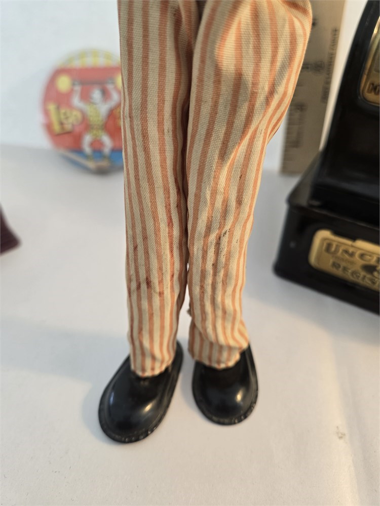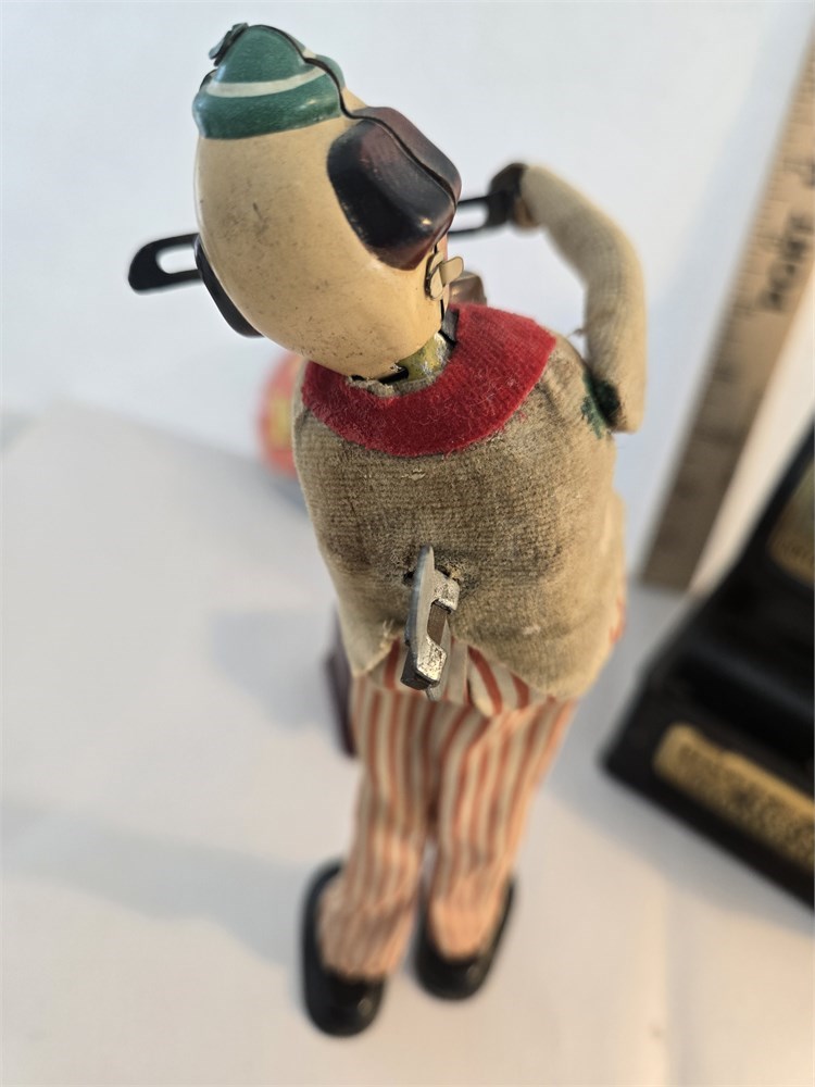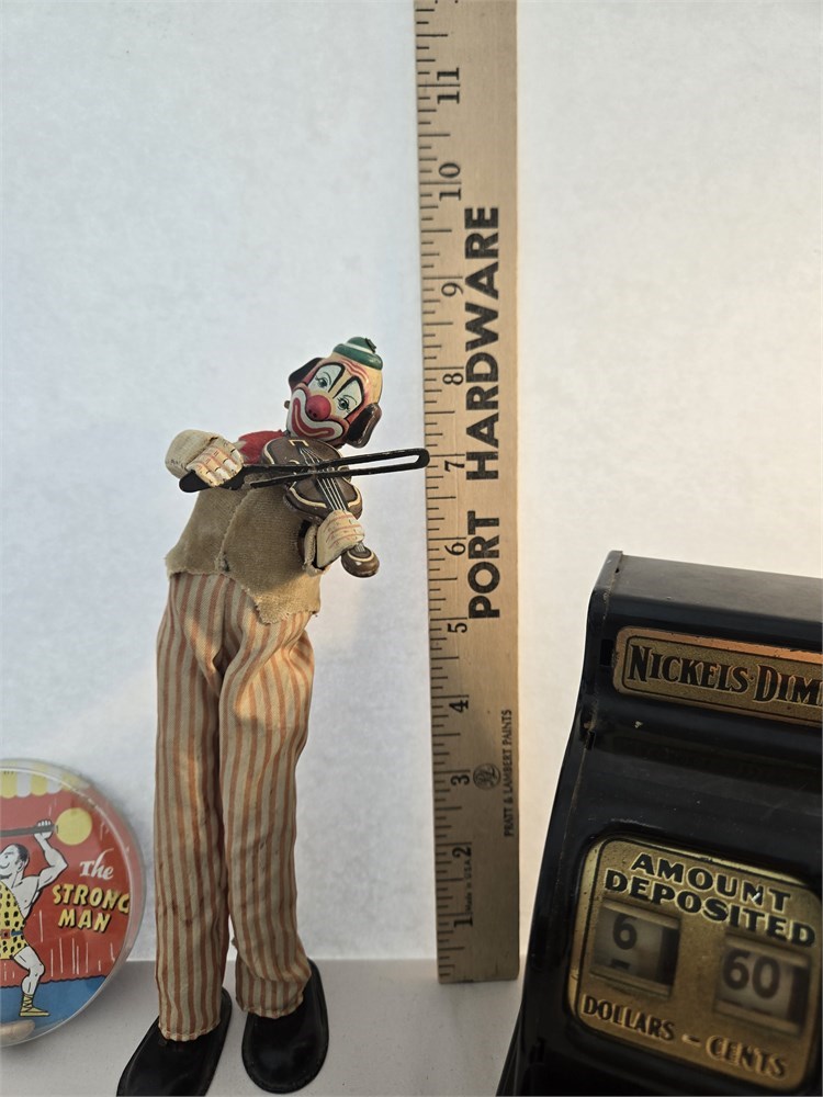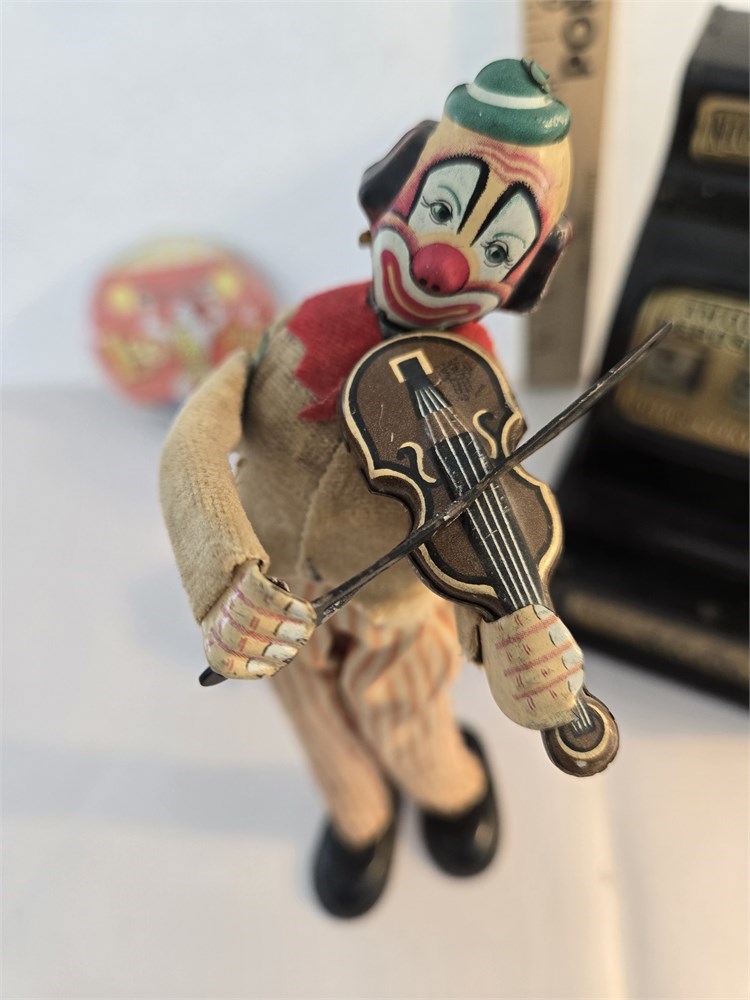 2. Wind-Up Clown Violin Player Toy – Standing approx. 8" tall, with lithographed tin head, hands, and shoes, cloth outfit, and wind-up mechanism at the back. When wound, the clown “plays” the violin. Shows age-appropriate wear, clothes a bit faded, but mechanism appears intact.