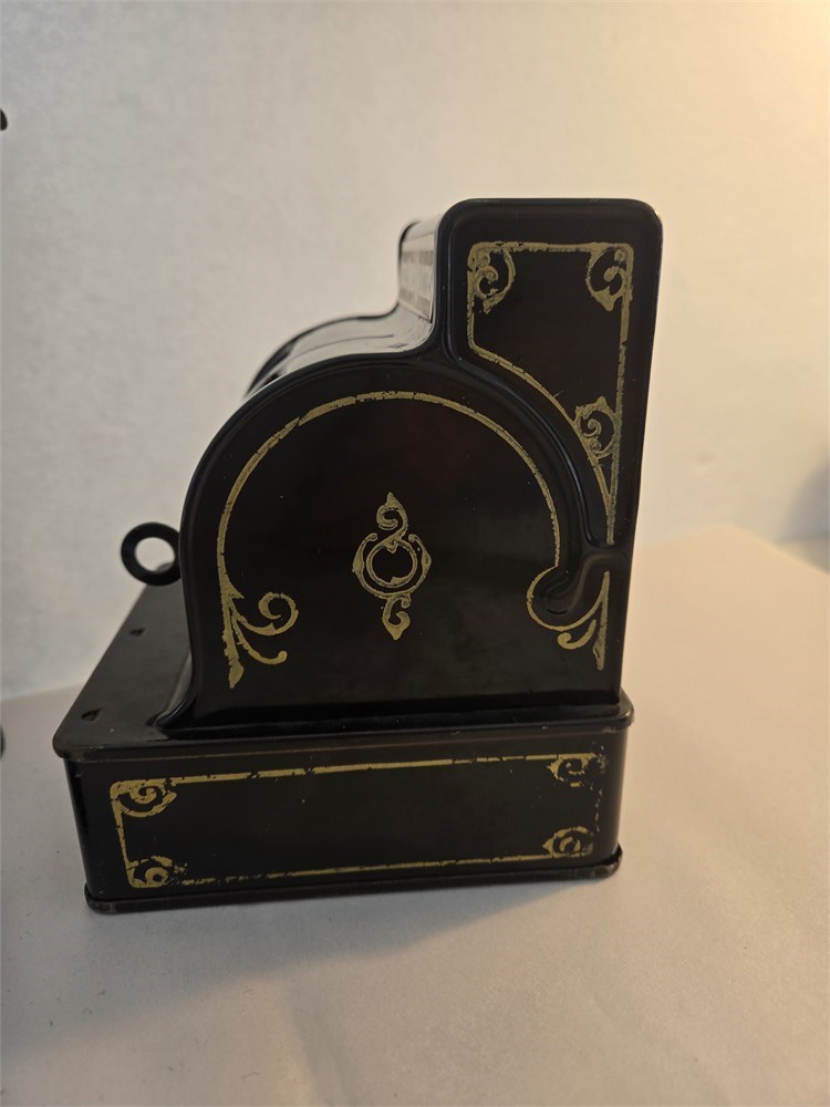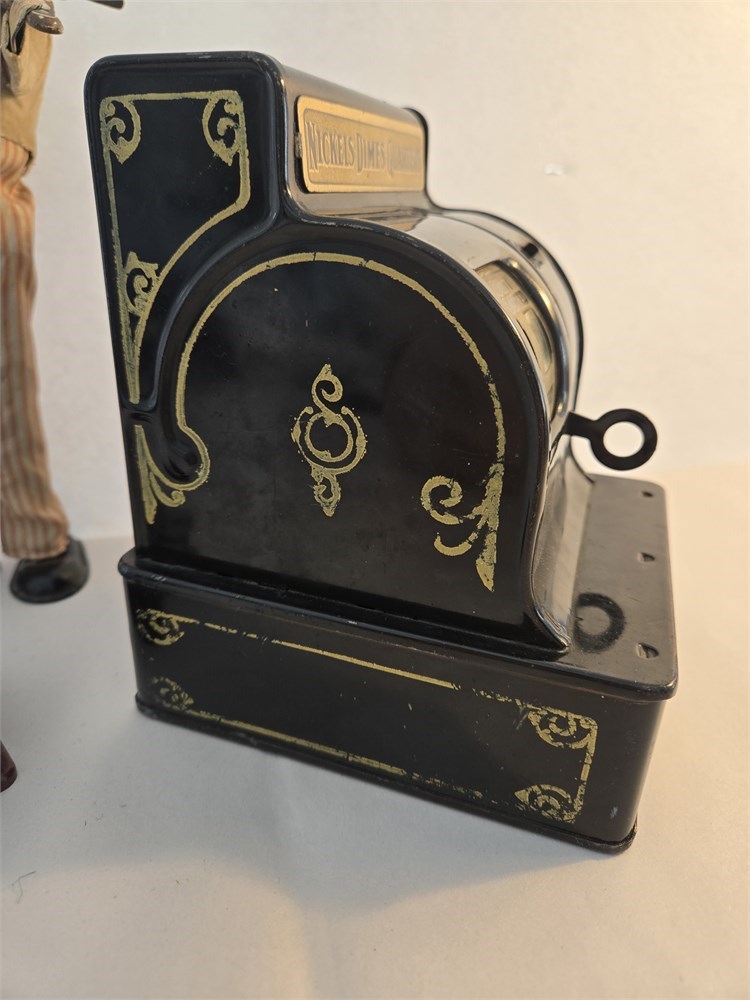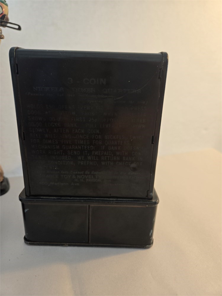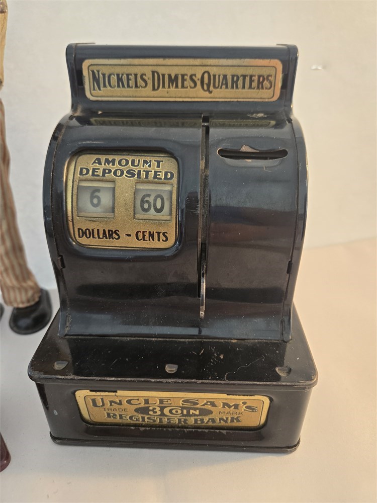 1. Uncle Sam’s 3 Coin Register Bank – Black painted tin litho with gold trim and ornate design. Accepts nickels, dimes, and quarters, with mechanical counter windows that record deposits. Marked on bottom. Nice example with some light surface wear.