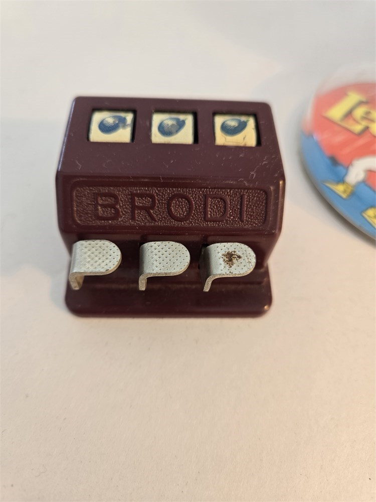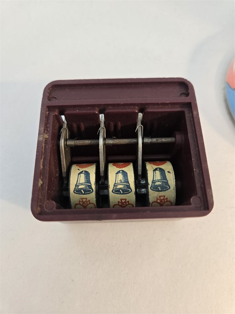 4. Brodi Miniature Slot Machine Bank – Small burgundy-colored toy with three working levers and spinning paper reels inside. Displays well with some light edge wear.