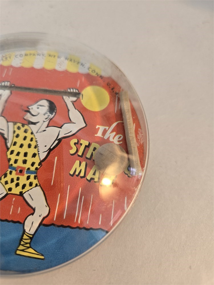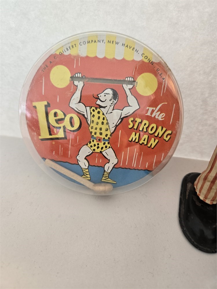 3. “Leo the Strong Man” Dexterity Puzzle – Produced by A.C. Gilbert Company, New Haven, Conn., USA. Litho tin puzzle with celluloid dome, featuring a strongman lifting weights with loose wood balls to be balanced in place. Some minor wear but overall bright graphics.