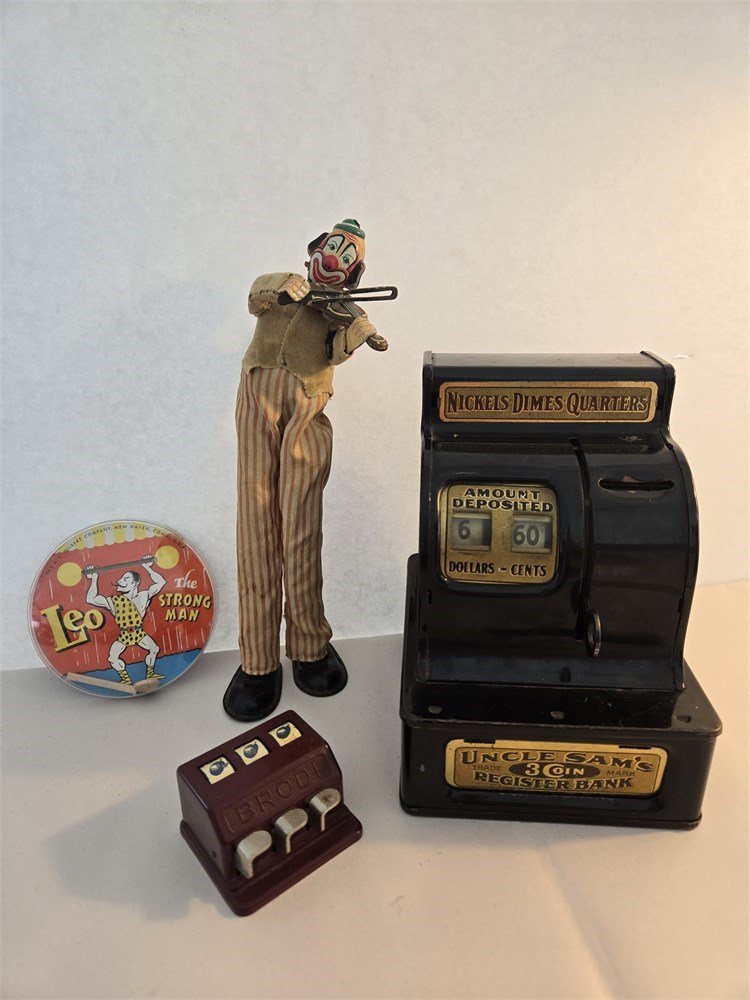 A great display group for collectors of mechanical banks, tin litho toys, or circus/carnival-themed items.