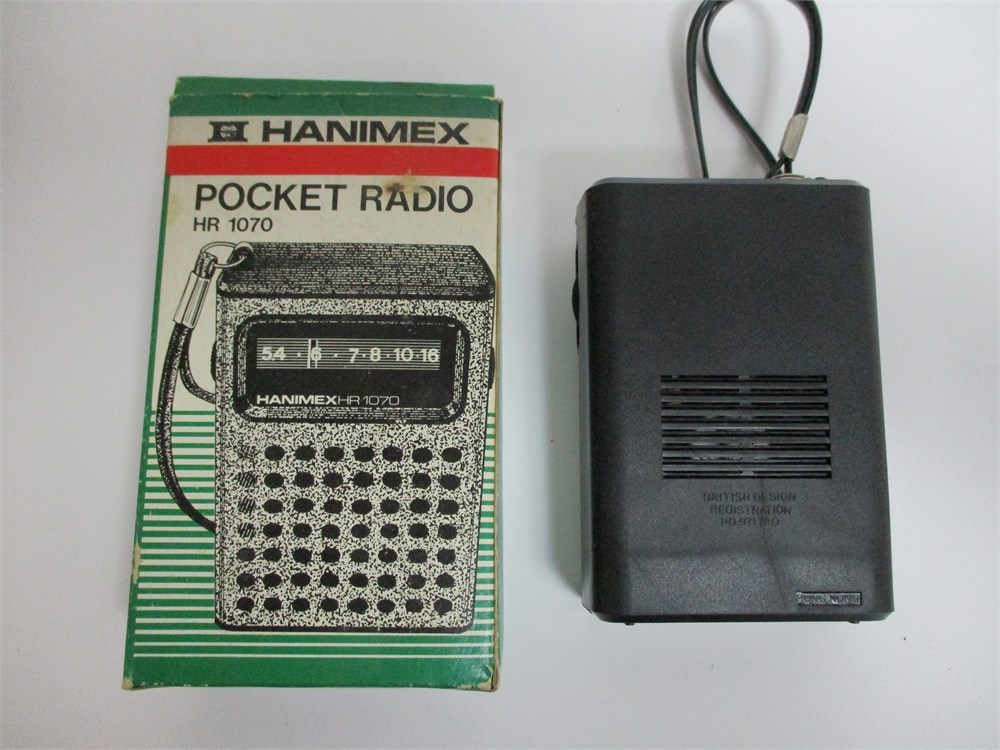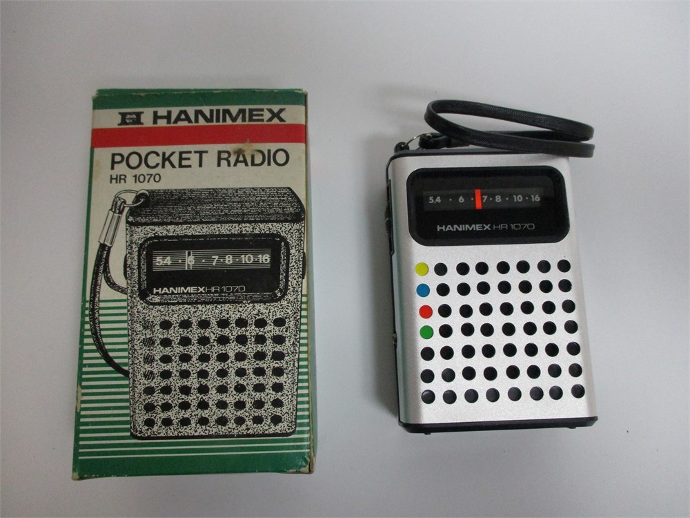This is a vintage Hanimex HR 1070 solid state pocket radio, a classic portable AM radio from the late 1970s to early 1980s.