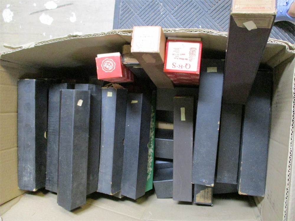 The lot appears to include a wide range of titles (unverified), with rolls housed in their original cardboard cases, some with labels intact. Conditions vary – some boxes show age wear, scuffs, and markings, but overall a solid collection for restoration, playing, or display.