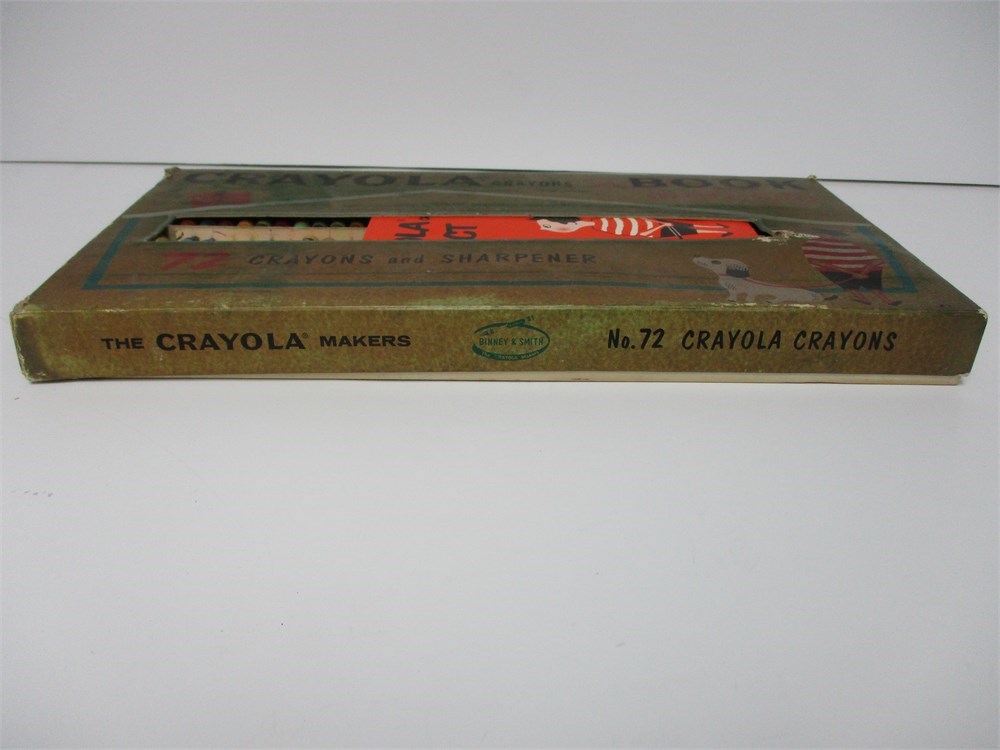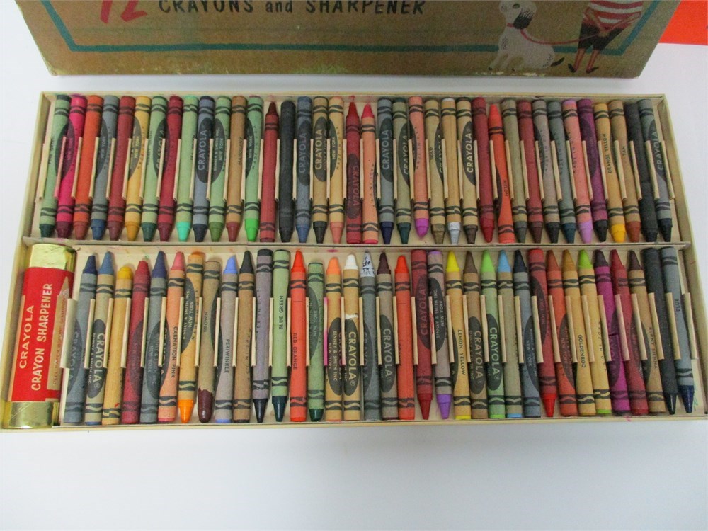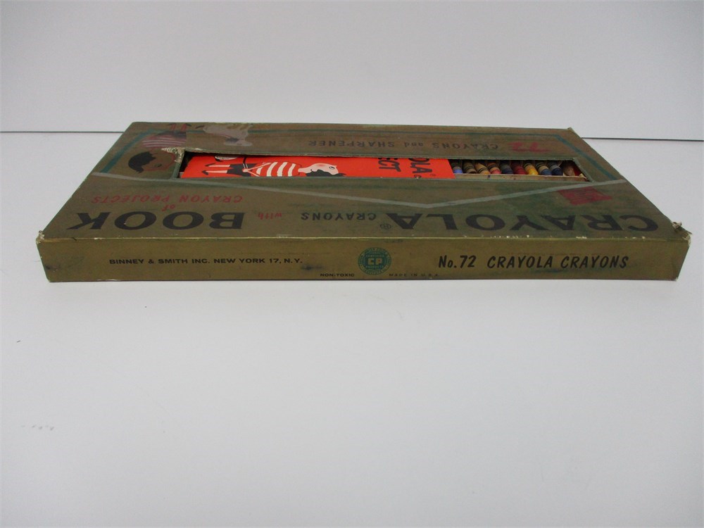 Condition: Box and insert intact with some wear; crayons partially used; sharpener and booklet present. A fine example for collectors of Crayola ephemera and mid-century school supplies.