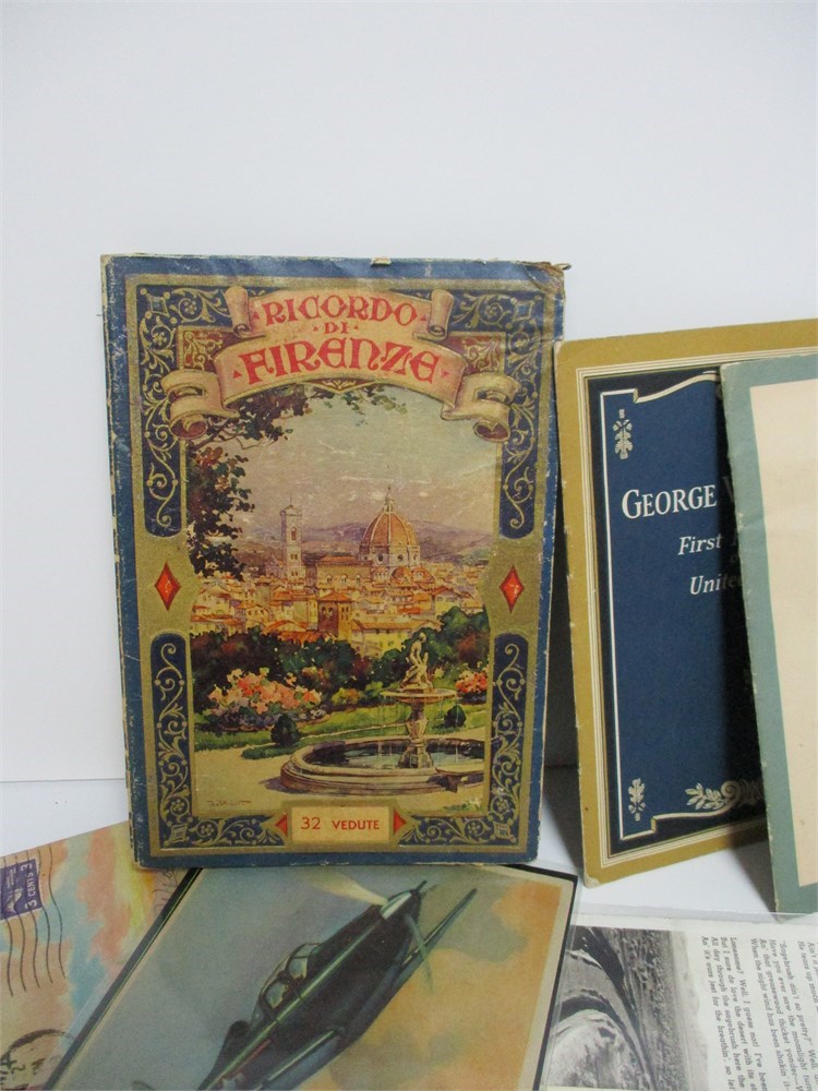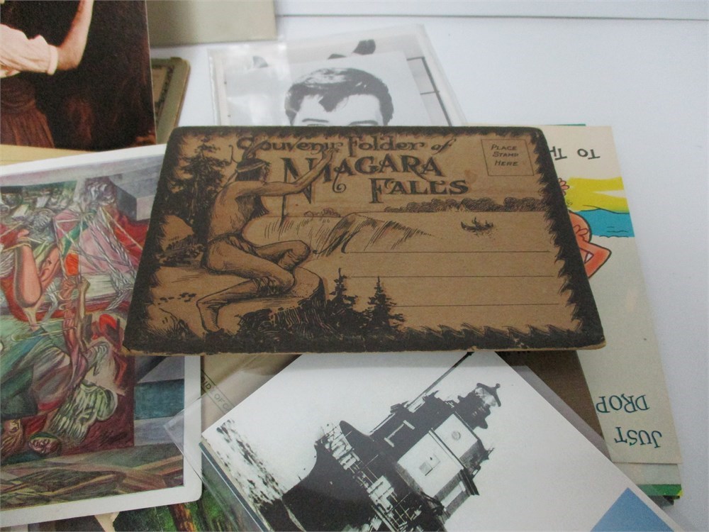 A varied collection of vintage paper ephemera including early and mid-20th century postcards, souvenir booklets, photographs, and illustrated paper items. Highlights observed in the lot include: