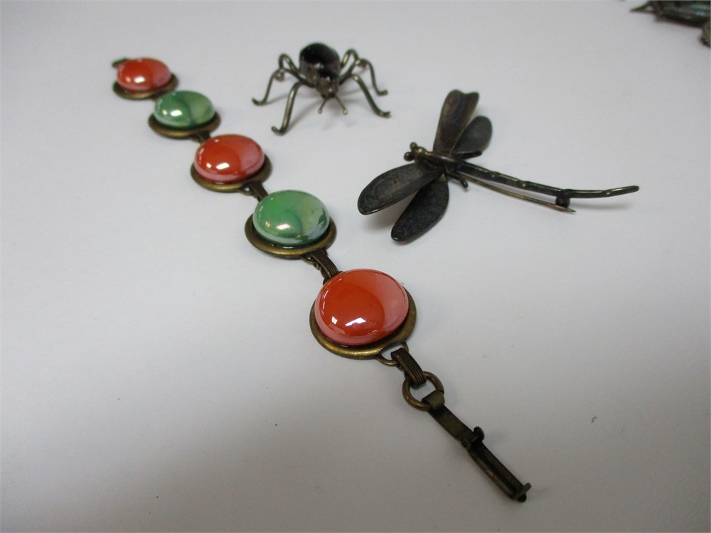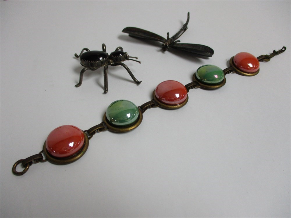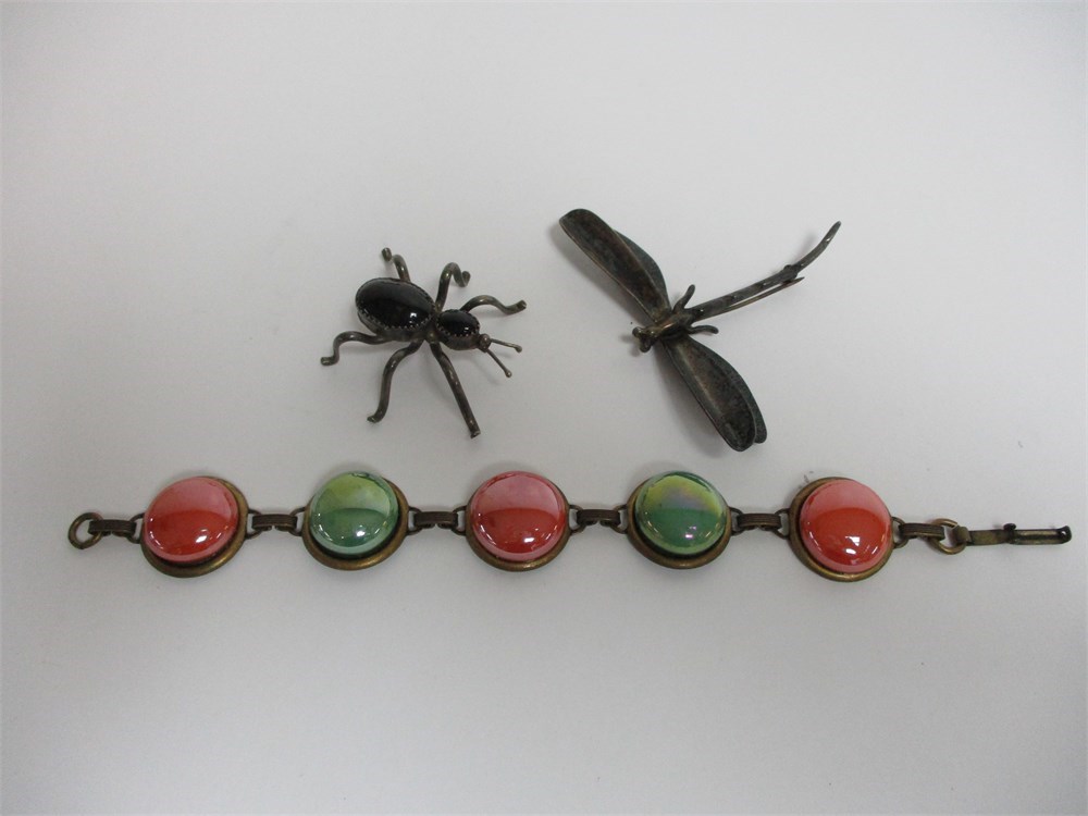 Vintage Sterling Jewelry: Bracelet with Glass Cabochons and Two Insect Brooches