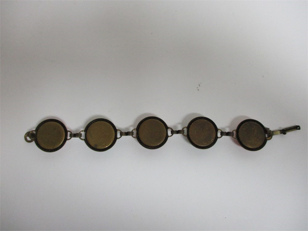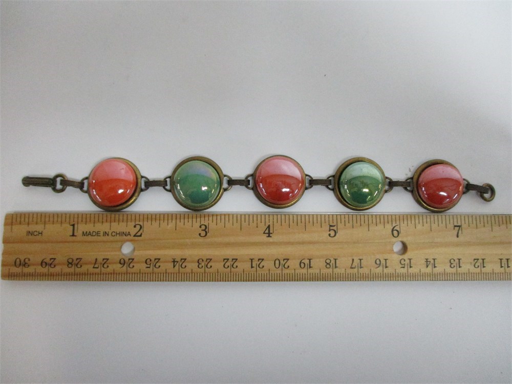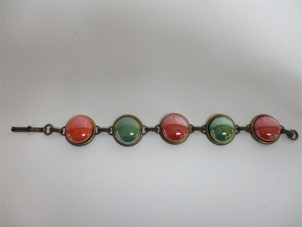 • A brass link bracelet set with alternating red and green domed glass cabochons (“gumdrop” style), mid-20th century.