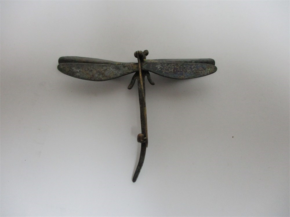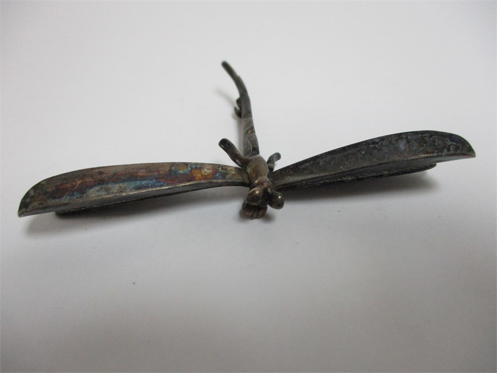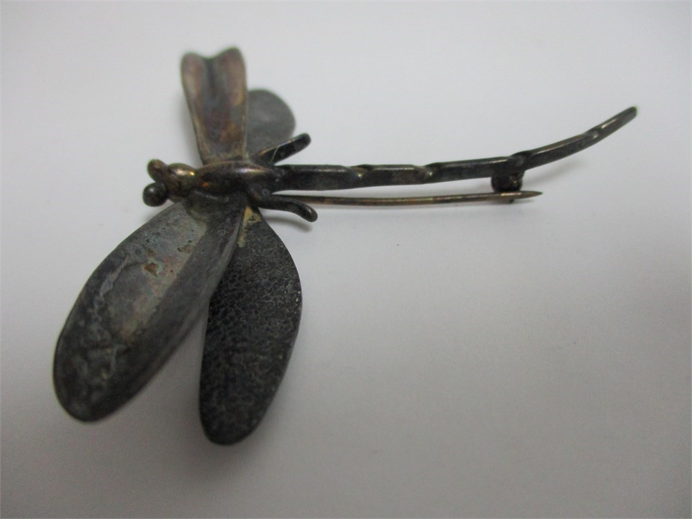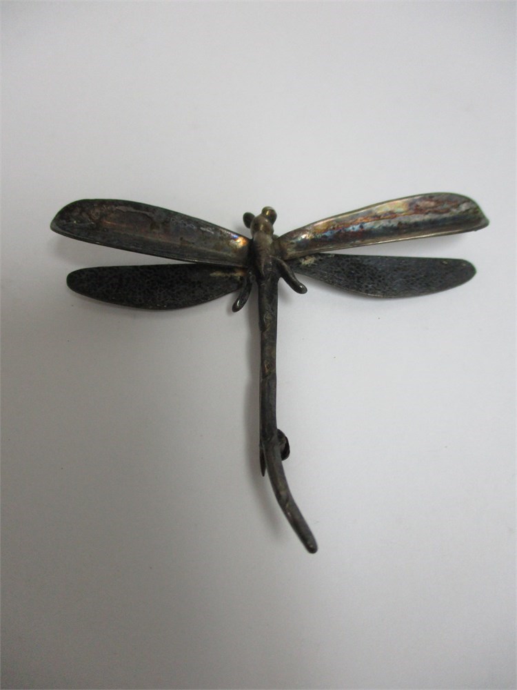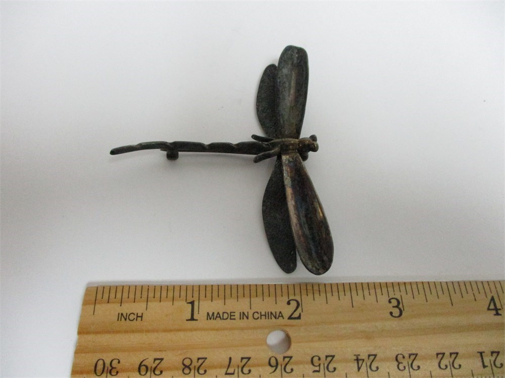 • A sterling silver dragonfly brooch (12.6g), with detailed wings and body, likely mid-century costume jewelry.