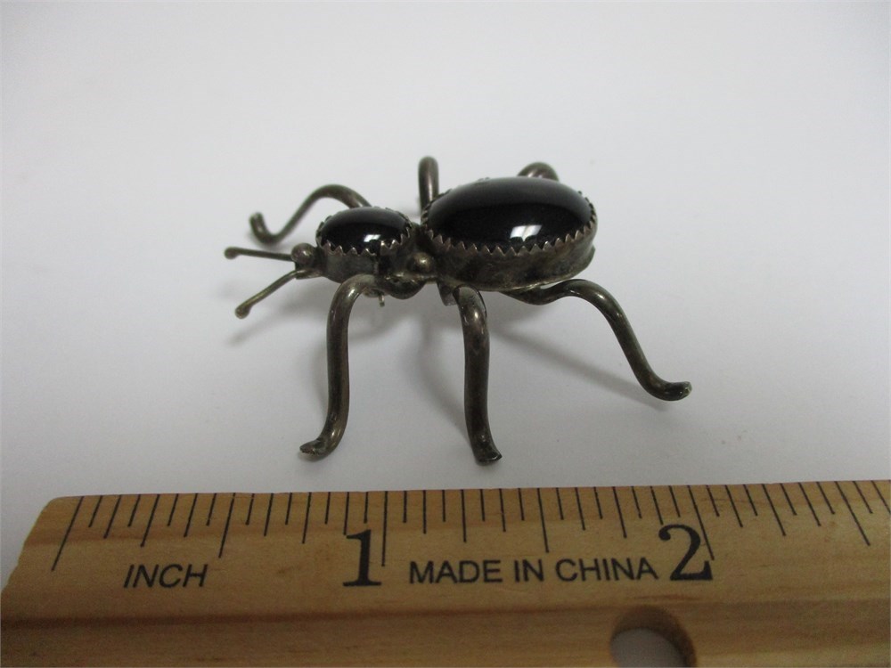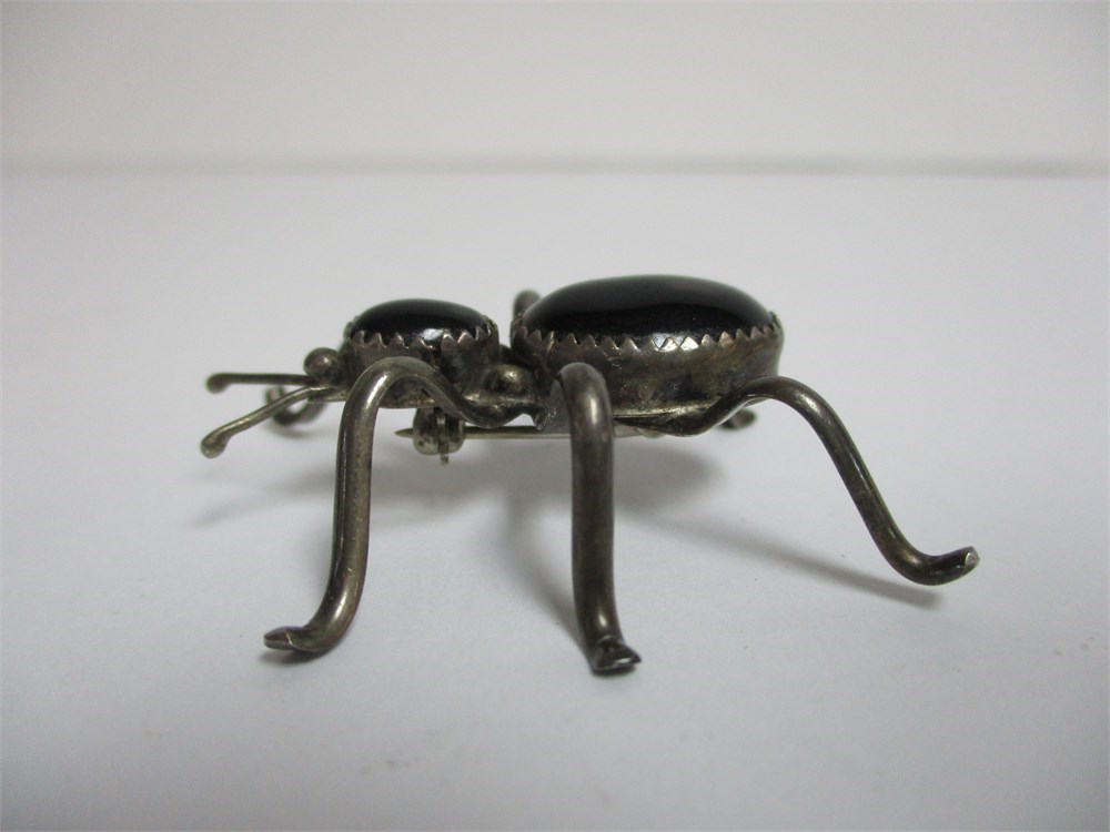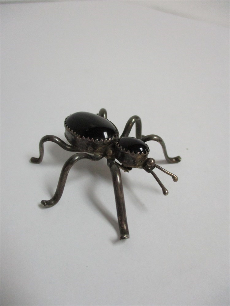 • A silver-tone ant brooch with large black cabochon body, stylized form.  Probably nickel.
