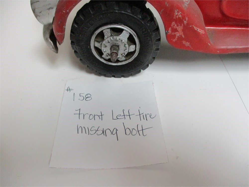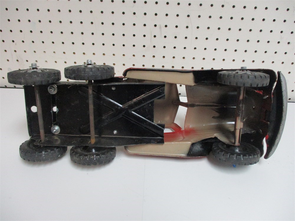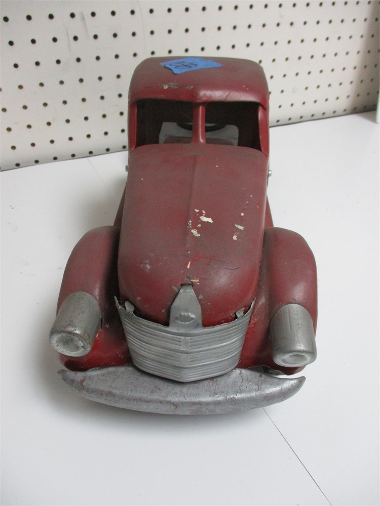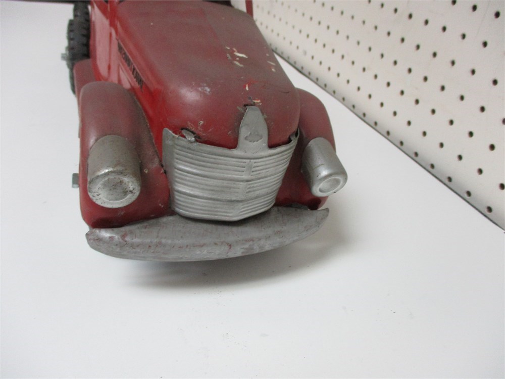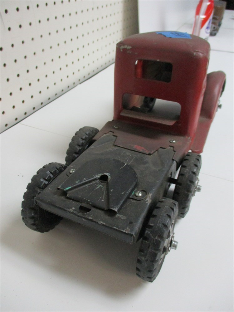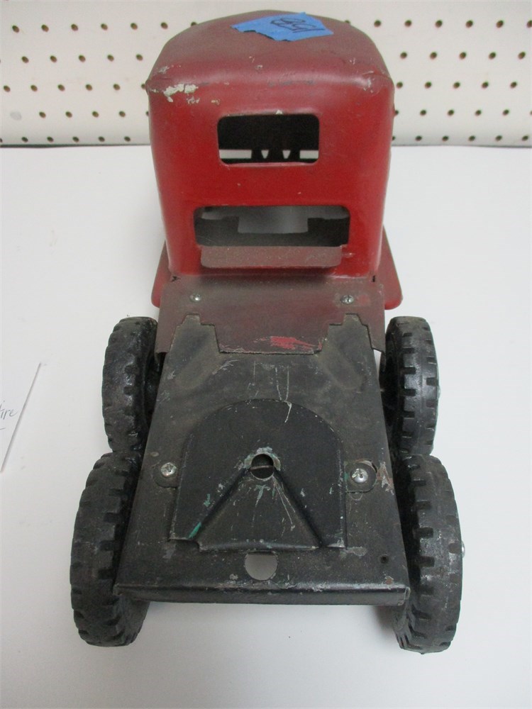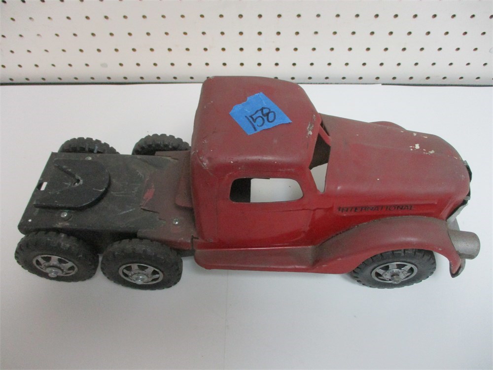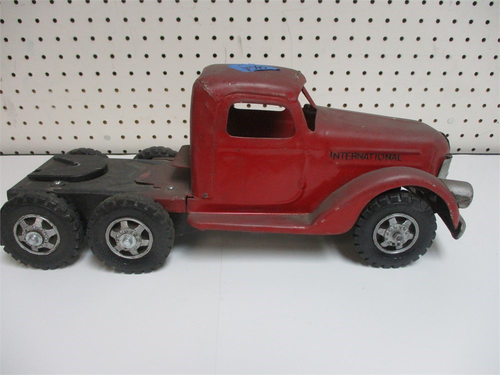Up for auction is a vintage pressed steel International tractor cab, produced mid-20th century by one of the well-known American toy makers (Structo, Hubley, or similar). This heavy-duty toy was built to last and represents the early postwar era of trucking.
