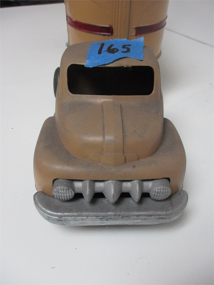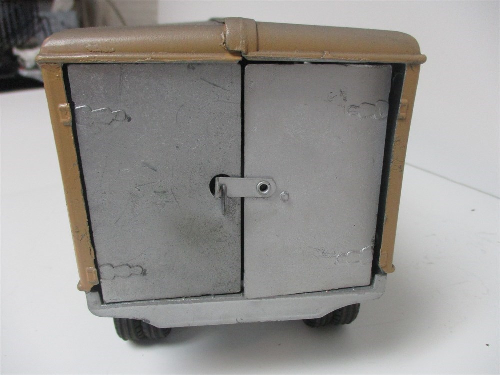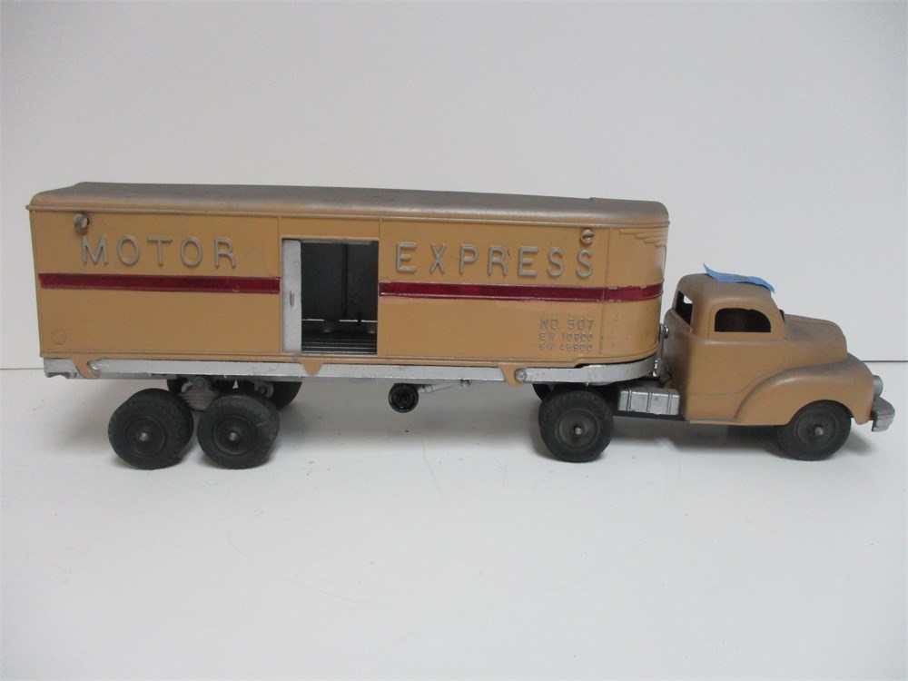 Offered here is a vintage pressed steel Hubley Kiddie Toy 500-Series tractor and trailer, made in Lancaster, PA, USA. This collectible piece features the “Motor Express” trailer with sliding side door and rear double doors, pulled by a streamlined cab-over style tractor with signature Hubley grille detail.