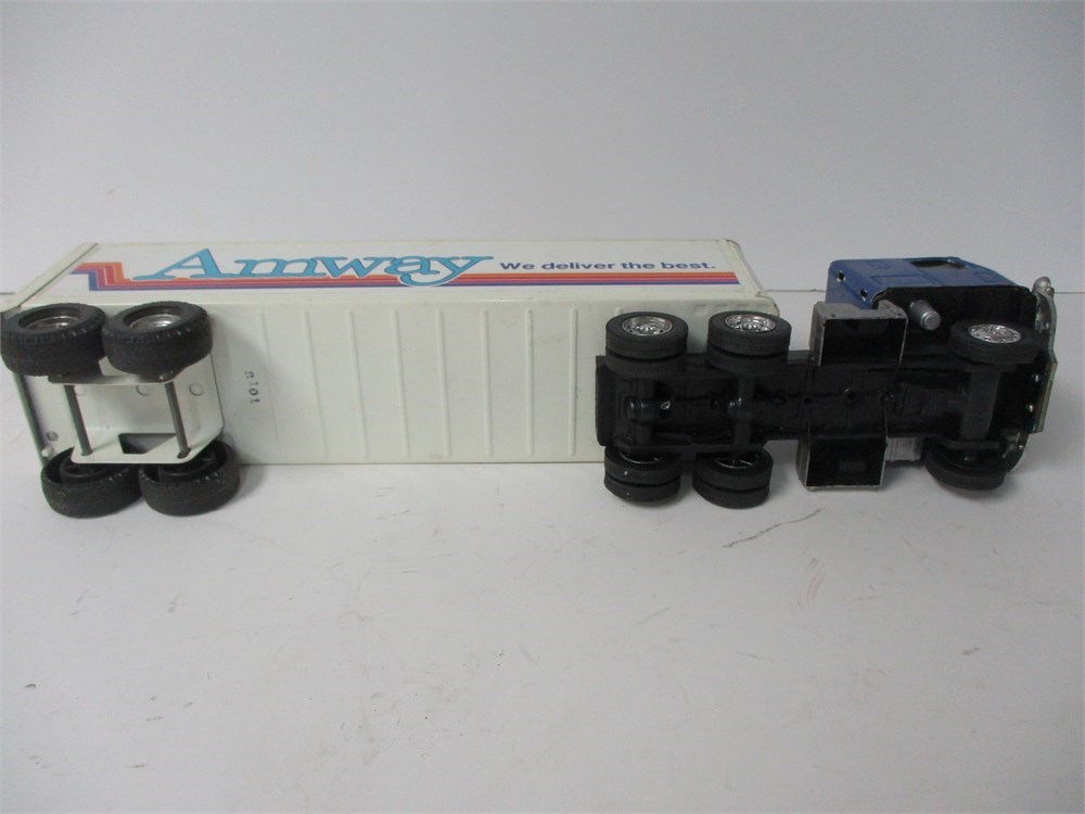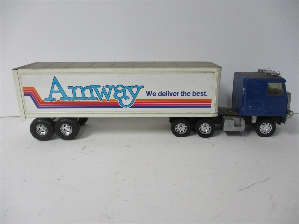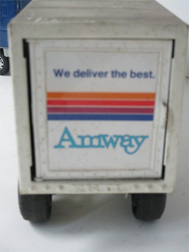 Pressed steel cab-over tractor with detachable van trailer, finished in blue and white. Trailer sides and rear decorated with bold Amway corporate graphics and slogan “We deliver the best.” Tractor cab with silver grille and bumper, tandem rear axles, and rubber tires.