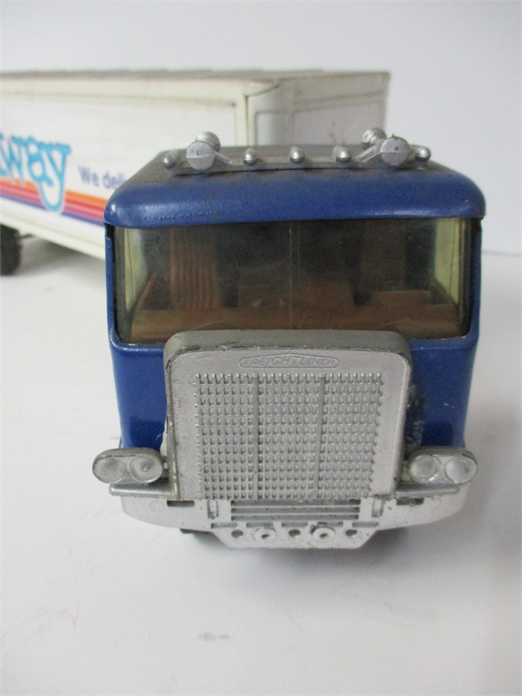 Condition: Original paint with light play wear and scattered rubs. Amway logos remain bright and legible. Wheels and axles intact, roll freely. Trailer and tractor connection secure.