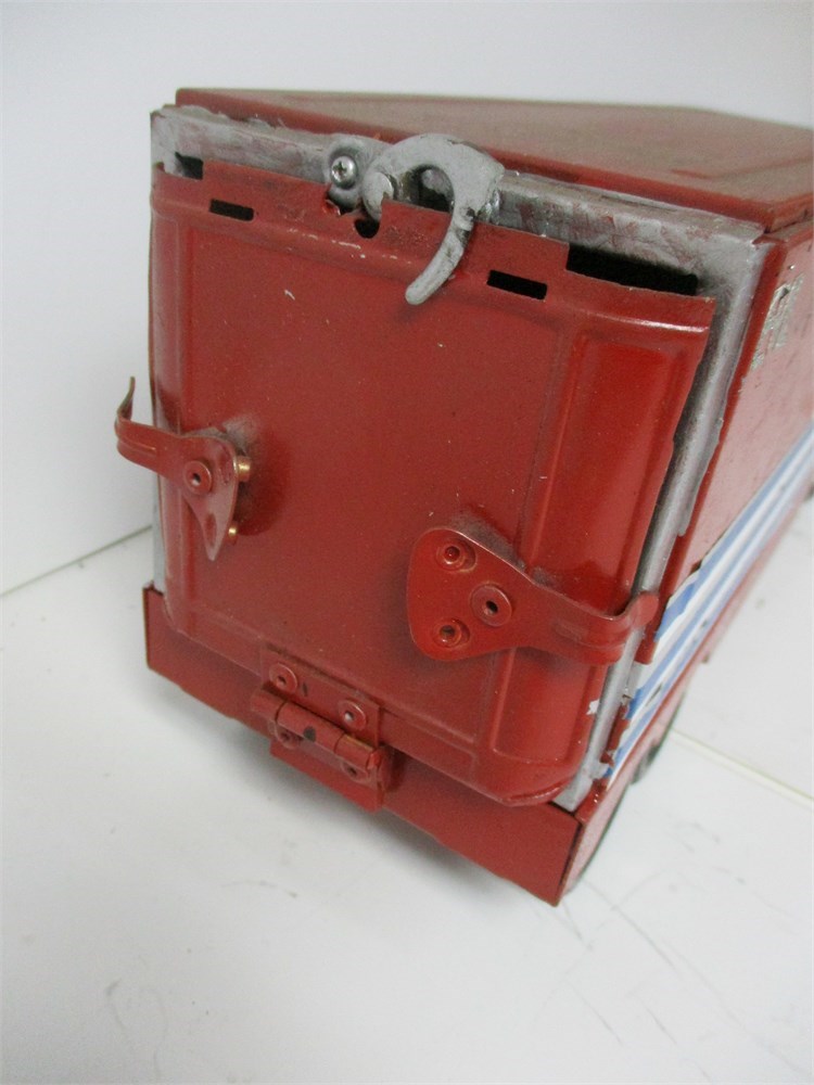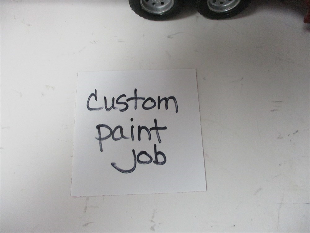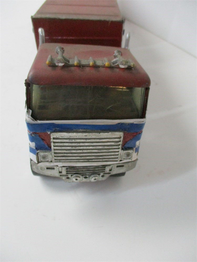 Condition: Playwear throughout with scratches and paint loss. Notable custom paint job over portions of cab and trailer, giving it a one-of-a-kind appearance. Wheels and axles intact, roll freely. Connections between tractor and trailer secure.