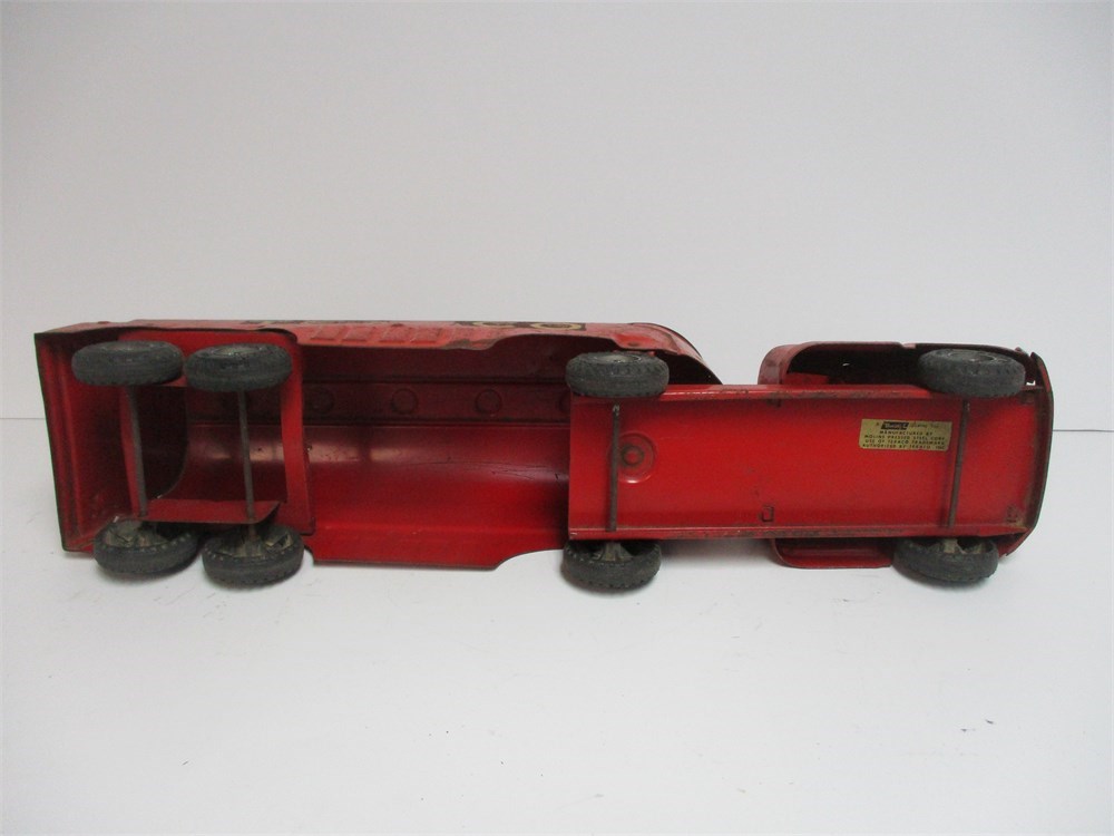 Condition: Original paint with surface wear, oxidation, and losses to lettering consistent with age and play. Grille intact, wheels and axles present, trailer connection secure. Displays with strong vintage service-station character.